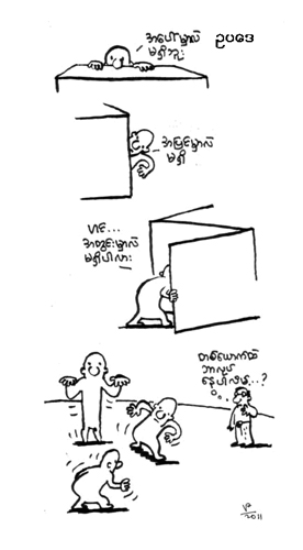 ယဥ္ယဥ္ေက်းေက်းဆိုရင္ ေခါင္းေလာင္းထိုးသူေတြ ေပါ့။ ဒီမိုကေရစီရဲ႕ စတုတၳမ႑ိဳင္နဲ႔ပတ္သက္ရင္ of the people, by the people, for the people လုိ႔ဆိုၾကတယ္။ ဒီအခန္းအနားမစခင္မွာ လႊတ္ေတာ္ကိုယ္စားလွယ္ တစ္ေယာက္နဲ႔ေတြ႕ေတာ့ “ဘာေတြလုပ္ေန၊ ေဆြးေႏြးေနလဲ” လုိ႔ ေမးမိတယ္။ သူက “ေဆြးေႏြးေနတာေတြ အတည္မျပဳရေသးခင္ ေျပာခြင့္မရွိဘူး” တဲ့။ ဒါဆို by the people က ဘယ္လိုလုပ္ျဖစ္ပါ့မလဲ။ ျပည္သူလူထု people က တို႔အတြက္ (for the people) ျဖစ္ရဲ႕လားဆိုတာ သိခြင့္မရွိဘူးဆိုတဲ့သေဘာ ျဖစ္ေနတယ္။ ကိုယ္က ကာတြန္းဆရာဆိုေတာ့ ကာတြန္းေတြး ေတြးတယ္။ စတုတၳမ႑ိဳင္ဆိုေပမယ့္ သုံးေခ်ာင္းေထာက္ထိုင္ခုံေတြ ေတြ႕တိုင္း “ေအာ္- သုံးေခ်ာင္းထဲနဲ႔လည္းျဖစ္သားပဲ” လို႔ ေတြးမိတယ္။