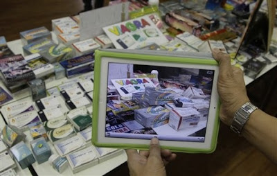 ထုိင္းအရာရိွတဦးက အနီေရာင္ရပ္ကြက္ လမ္းေဘးေစ်းသည္တုိ႔ ထံမွ သိမ္းဆည္းထားသည့္ ဗီတာမင္ V ေခၚ Viagra ေဆးကုိ ျပသေနပုံ (ဓာတ္ပုံမ်ား – ေအပီသတင္းဌာန)
