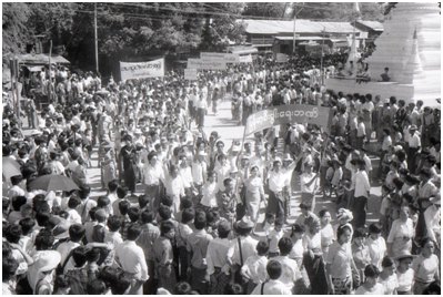 ဒီေန႔မွာ .. ေရနံေျမအလုပ္သမားေတြက .. သူတုိ႔ရဲ႕ လုပ္ငန္းခြင္ေတြကုိစြန္႔ခြာၿပီး .. ေက်ာင္းသားသမဂၢရွိရာ သပိတ္စခန္းကုိ ခ်ီတက္လာၾကတယ္ .. ၿပီးေတာ့ .. ေရနံေျမ အလုပ္သမားသမဂၢ ဆုိတာကုိ ေရနံေျမအလုပ္သမားအမ်ားစု ေထာက္ခံမႈနဲ႔ ဖြဲ႔လုိက္ၾကတယ္ .. ဥကၠ႒က .. ဦးခင္ဝင္း (ယခု အမ်ဳိးသားဒီမုိကေရစီအဖြဲ႔ခ်ဳပ္ ၿမိဳ႕နယ္ ဥကၠ႒) အတြင္းေရးမွဴးက ဦးခ်စ္ညီညီ (လႊတ္ေတာ္ ကုိယ္စားလွယ္ေလာင္း အမ်ဳိးသားဒီမုိကေရစီပါတီ) … ေရနံေျမအလုပ္သမားတပ္ႀကီး ခ်ီတက္လာေတာ့ .. ၿမိဳ႕ေနလူထုက ေသာင္းေသာင္းဖ်ဖ် ႀကိဳဆုိၾကတဲ့ျမင္ကြင္းကုိ အခုထိ သတိရေနဆဲပါ .. တခါ…ပြင့္ျဖဴ၊ စလင္းနယ္ဘက္က လယ္သမားေတြနဲ႔ ေရနံေခ်ာင္းပတ္လည္ရြာေတြက လယ္သမားေတြလည္း ခ်ီတက္လာမယ္ဆုိတဲ့ … သတင္းေတြကုိလည္း ရထားတယ္ … တခ်ဳိ႕ရြာေတြက လယ္သမားေတြ .. ေမာ္ေတာ္ေတြနဲ႔ တက္လာၿပီတဲ့ … ဒါနဲ႔ .. က်ေနာ္တုိ႔လည္း သူတုိ႔လာခ်ိန္နဲ႔တုိက္ၿပီးမွ .. စီတန္းလွည့္လည္ ဆႏၵျပပြဲကုိထြက္ဖုိ႔ ဆုံးျဖတ္လုိက္ၾကတယ္ … မနက္ ၉ နာရီမွာစတင္ၿပီး သပိတ္ဆႏၵျုပစစ္ေၾကာင္းကုိ စခန္းထဲကေန စတင္ထြက္ခြာလုိက္ၾကတယ္ … ဒီေန႔ ေနကလည္း အရင္ေန႔ကထက္စာရင္ နည္းနည္း ျပင္းသလား မသိဘူး .. လူေတြၾကည့္လုိက္ရင္ ေခၽြးသံတရြဲရြဲနဲ႔ .. ဒါေပမယ့္ ဘယ္သူမွ ေမာရပမ္းရေကာင္းမွန္း မသိ .. ျမင့္ေငြဆုိရင္ .. ေရွ႕က ေႂကြးေၾကာ္သံတုိင္ရလြန္းလုိ႔ အသံေတြဝင္ၿပီး ထြက္ေတာင္ မထြက္ေတာ့ဘူး … ၿမိဳ႕လည္ေစ်းတေနရာေရာက္ ေတာ့ .. က်ေနာ္စီးလာတဲ့ ဖိနပ္က ျပတ္သြားတယ္ .. အဲဒါကုိ သပိတ္တပ္ဦးမွာ အလံကုိင္လာတဲ့ .. ေက်ာင္းသား .. သူ႔နာမည္က သန္းေဇာ္ဦးတဲ့ .. ေရနံေခ်ာင္းေကာလိပ္မွာ တက္ေနတာ .. သူက ခ်က္ျခင္း သူ႔ဘိနပ္ကုိခၽြတ္ၿပီး က်ေနာ့္ကုိထုိးေပးေတာ့ က်ေနာ္က ျငင္းတယ္ … ဒါေပမယ့္ မရဘူး။ သူက ဇြတ္အတင္းထုိးေပးတာနဲ႔ .. က်ေနာ္လည္း အားနာၿပီး ယူစီးလုိက္မိတယ္ .. ဒါနဲ႔ … က်ေနာ္က …