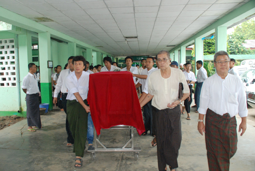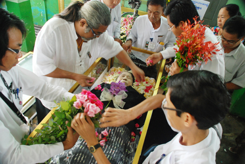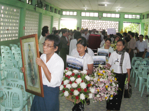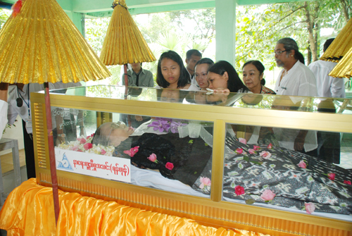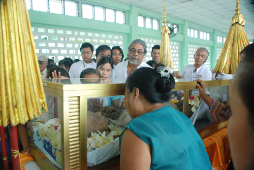 ၂၉. ၈. ၂၀၁၁ တနလၤာေန႔ နံနက္ ၁၁း၀၀ နာရီအခ်ိန္တြင္ ေက်းဇူး႐ွင္ ဘဘဦးသုခ၏ဇနီး မိခင္ႀကီး ေဒၚက်င္ေမအား မီးသၿဂႋဳဟ္ျခင္း အခမ္းအနားကို ေရေဝးသုႆန္တြင္ က်င္းပခဲ့သည္။ ယင္း အခမ္းအနားတြင္ ဘဘဦးသုခႏွင့္ မိခင္ႀကီး ေဒၚက်င္ေမ၏ သား – သုခ (သား) (ခ) ကိုရဲေအာင္ႏွင့္ ေျမးျဖစ္သူတို႔ႏွင့္အတူ ေဆြမ်ဳိးသားခ်င္းမ်ားအျပင္ ဘဘဦးသုခ၏ သားတပည့္မ်ား၊ လက္တြဲေဖာ္မ်ား၊ ဧည့္ပရိသတ္မ်ားႏွင့္ နာေရးကူညီမႈအသင္း(ရန္ကုန္) အသင္းသူ/သားမ်ားတို႔ျဖင့္ ၿငိမ္းခ်မ္းၿငိမ္သက္စြာ က်င္းပၿပီးစီးခဲ့သည္။