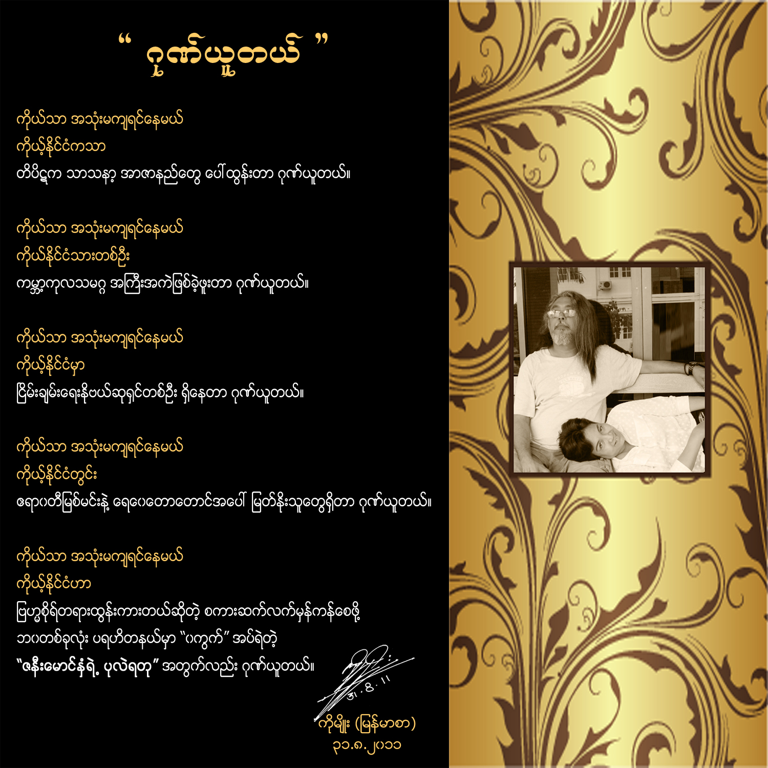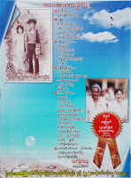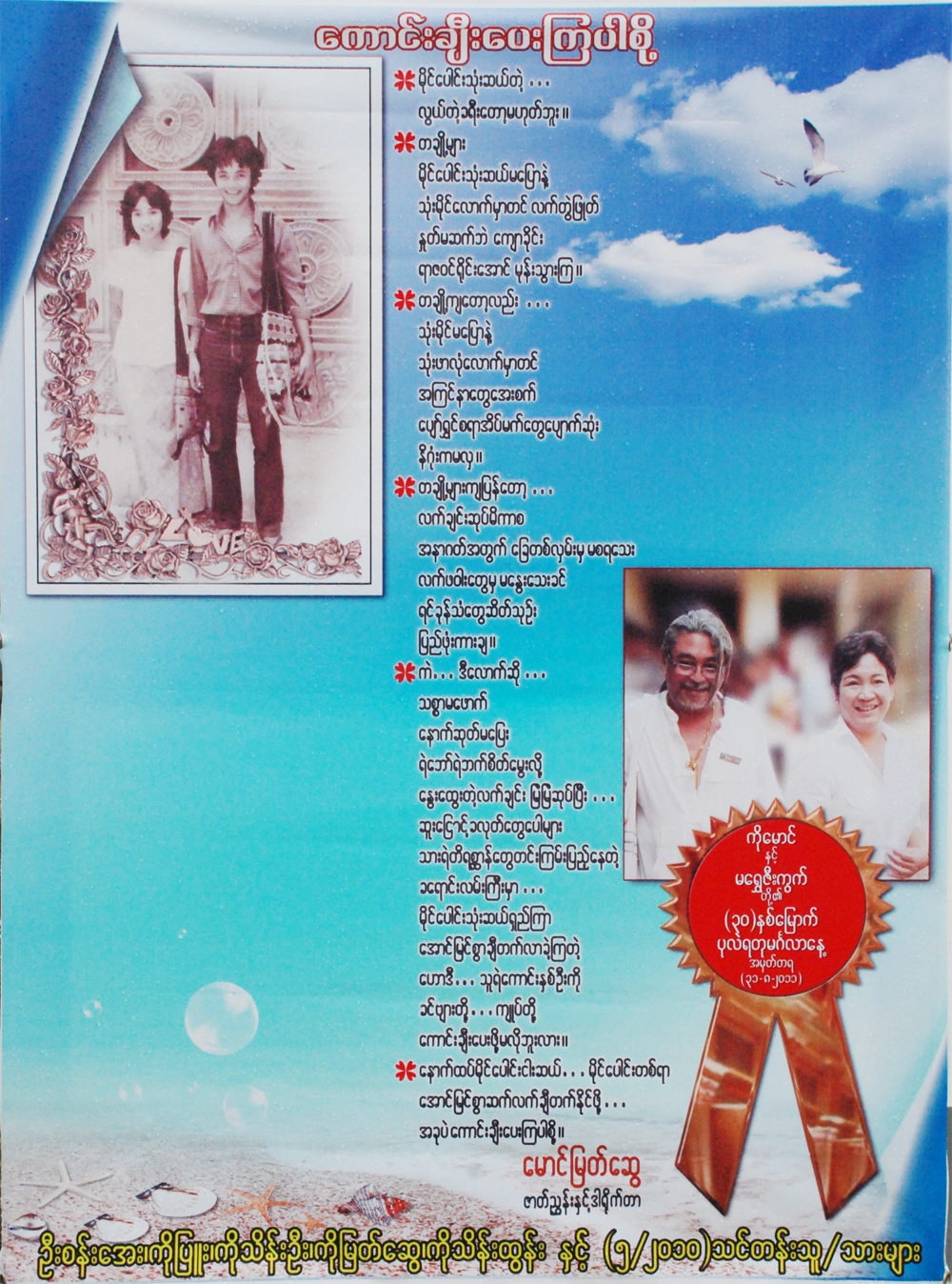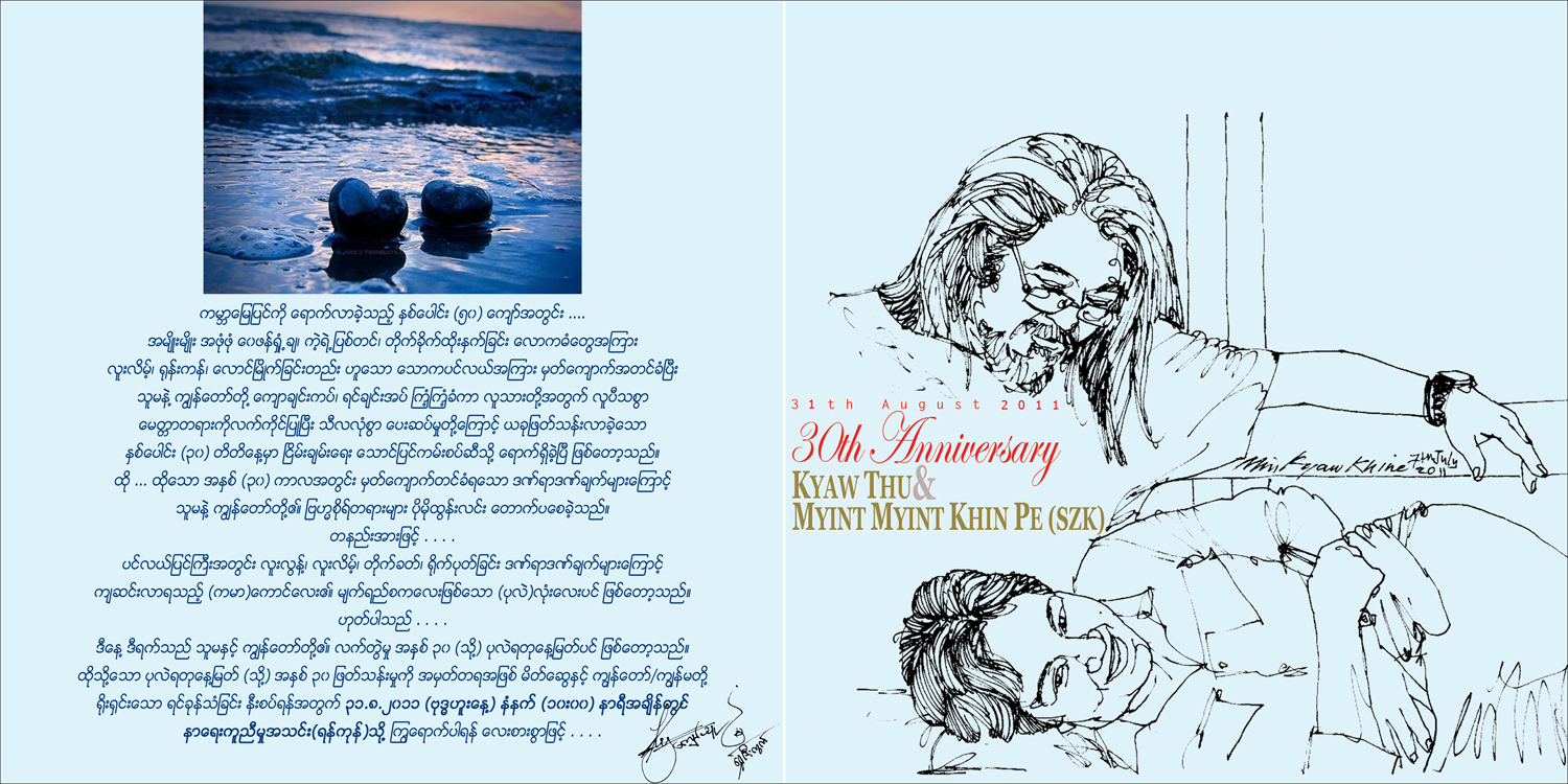 ကမ႓ာေျမျပင္သို႔ ေရာက္လာခဲ့ၿပီးသည့္ေနာက္ အမ်ဳိးမ်ဳိးအဖံုဖံု ေဝဖန္႐ႈံ႕ခ် ကဲ့ရဲ႕ျပစ္တင္ တိုက္ခိုက္ထုိးႏွက္ျခင္း ေလာကဓံေတြအၾကား လူးလိမ္႐ုန္းကန္ ေလာင္ၿမိဳက္ျခင္းတည္း ဟူေသာ ေသာကပင္လယ္အၾကား မွတ္ေက်ာက္အတင္ခံၿပီး ေက်ာျခင္းကပ္ ရင္ျခင္းအပ္ ႀကံ့ႀကံ့ခံကာ လူသားတို႔အတြက္ လူပီသစြာ ေမတၱာတရားကို လက္ကိုင္ျပဳၿပီး သီလလံုစြာ ေပးဆပ္ခဲ့ေသာ သူမႏွင့္ ကၽြန္ေတာ္တို႔ ျဖတ္သန္းခဲ့ေသာ ႏွစ္ေပါင္း ၃၀ တိတိေန႔ (သို႔) ပုလဲရတုေန႔ျမတ္ကို ၃၁. ၈. ၂၀၁၁ ဗုဒၶဟူးေန႔ နံနက္ ၁၀း၀၀ နာရီအခ်ိန္တြင္ နာေရးကူညီမႈအသင္း(ရန္ကုန္)၌ က်င္းပျပဳ လုပ္ခဲ့သည္။