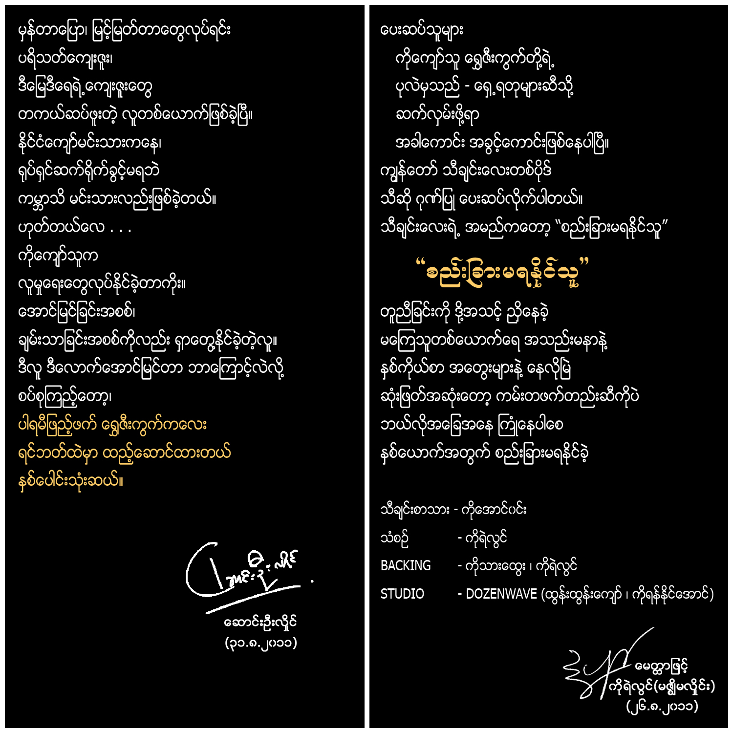 ဧည့္ပရိသတ္မ်ား ႏႈတ္ခြန္းဆက္၍ ျပန္လည္ထြက္ခြာသြားခ်ိန္တြင္ ဦးရဲလြင္ (မဇိၩမလိႈင္း)၏ ဂုဏ္ျပဳသီဆိုေပးထားေသာ “စည္းျခားမရႏိုင္သူ” သီခ်င္းအား ေက်ာ္သူ+ေ႐ႊဇီးကြက္တို႔ ငယ္စဥ္သမီး ရည္းစားဘဝမွ ယခုအခ်ိန္ထိ အႏွစ္ ၃၀ ျဖတ္သန္းခဲ့ေသာ ပံုရိပ္လႊာမ်ားျဖင့္ ေဖာ္က်ဴးထားေသာ DVD အခ်ပ္အား လက္ေဆာင္ အျဖစ္၎၊ အႏွစ္ ၃၀ ျပည့္ အထိမ္းအမွတ္ ထုတ္ထားေသာ T-Shirt အက်ႌအား အမွတ္တရအျဖစ္ ျပန္လည္၍ ေပးအပ္ပါသည္။
