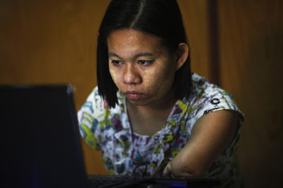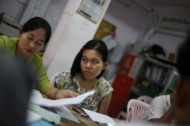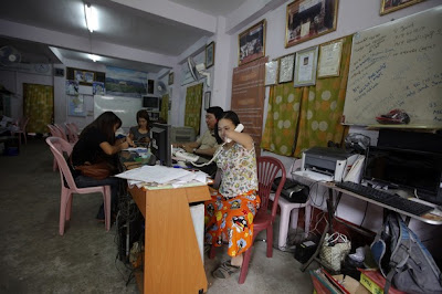 ျမန္မာႏုိင္ငံ ကိုယ္အဂၤါမသန္စြမ္းသူမ်ားအသင္းရုံးတြင္ တယ္လီဖုန္းျဖင့္ စကားေျပာေနေသာ စုပုံခ်စ္ (ဓာတ္ပုံ- Reuters သတင္းဌာန)
