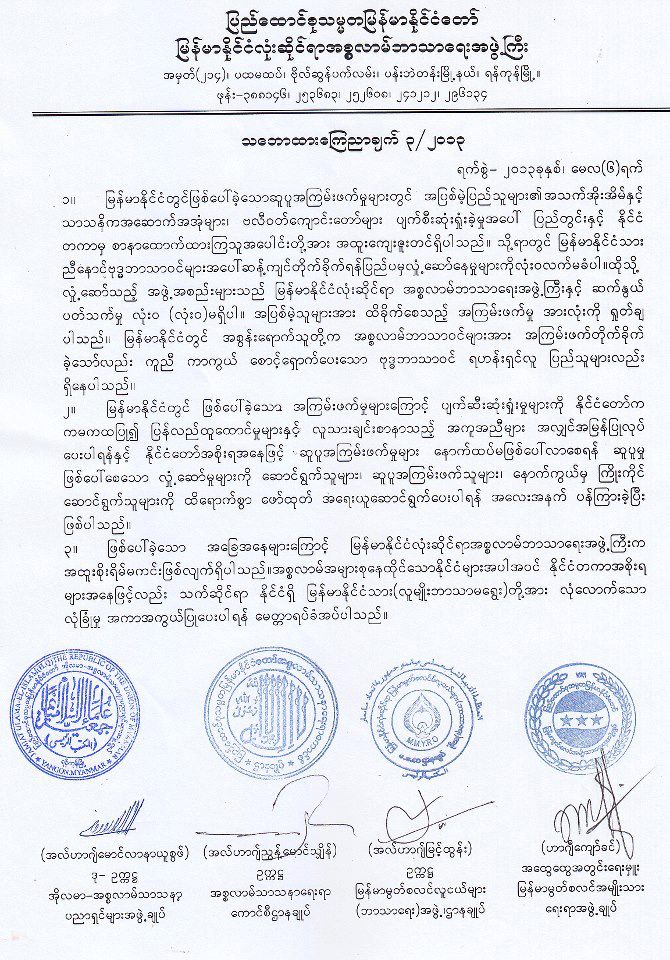 ျမန္မာႏိုုင္ငံလုုံးဆိုုင္ရာ အစၥလာမ္ဘာသာေရးအဖြဲ႔ၾကီးက ျပည္ပ၏လႈံေဆာ္မႈမ်ားကိုု လက္မခံေၾကာင္း ထုုတ္ျပန္