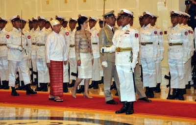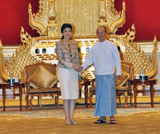 ေနျပည္ေတာ္တြင္ ယမန္ေန႔က ေတြ႔ရေသာ ထုိင္း၀န္ႀကီးခ်ဳပ္ မစၥ ရင္လပ္ ရွင္နာ၀ပ္ ႏွင့္ သမၼတ ဦးသိန္းစိန္ (ဓာတ္ပုံမ်ား-AP)