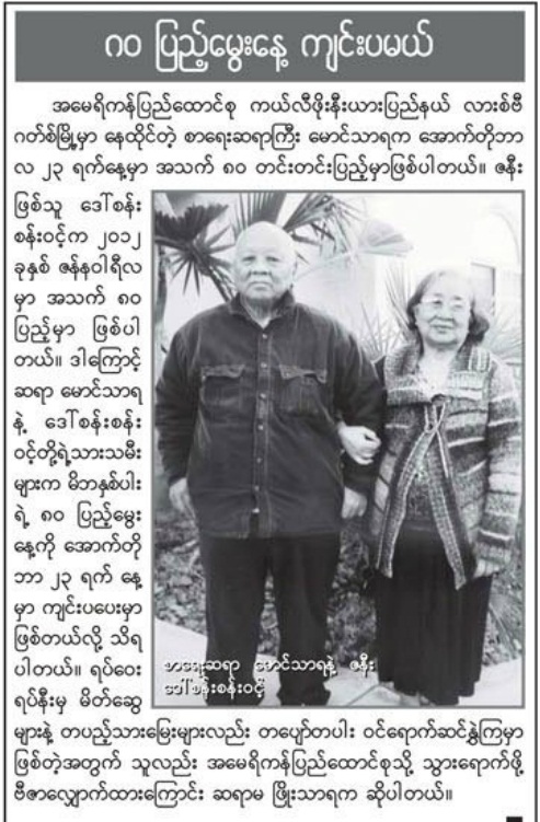 အေမရိကန္နုိင္ငံေရာက္ စာေရးဆရာႀကီးေမာင္သာရက ယခုလအတြင္း က်ေရာက္မည့္ သူ၏ အသက္ ၈၀ ျပည့္ ေမြးေန႔ကုိ မိသားစုႏွင့္အတူက်င္းပမည္ဟု ေအာက္တုိဘာ ၃ ရက္ေန႔ထုတ္ အလင္းတန္းဂ်ာနယ္တြင္ ေဖာ္ျပထားသည္။