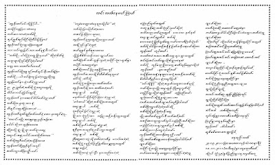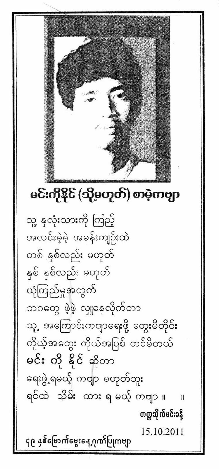 ကုိမင္းကုိႏုိင္ရဲ႕အမျဖစ္သူ မငယ္က သူ႔ေမာင္ေလးကုိ က်ဳိင္းတုံေထာင္မွာ ေထာင္၀င္စာသြားေတြ႕ရင္း ၾကံဳေတြ႕ခဲ့ရတဲ့ ခံစားမႈကုိဖြဲ႕ဆုိထားတဲ့ ကဗ်ာတပုဒ္ကုိ ဖတ္ျပခဲ့ပါတယ္။