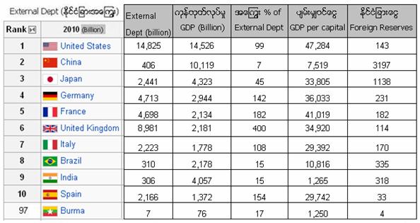 အေမရိကန္ ၂၀၁၀ ဘတ္ဂ်တ္အရ အေမရိကန္သည္၀င္ေငြ 2.162 Trillion, သံုးေေငြ 3.456 Trillion ႏွင့္ အေၾကြး (Gross ExternalDebt) 14.390 Trillion ရွိေနပါသည္။ တရုပ္ႏိုင္ငံ သည္ ၀င္ေငြ 1.149 Trillion,သံုးေငြ 1.270 Trillion ႏွင့္ အေၾကြး 0.406 Trillion သာ ရွိပါသည္။တရုပ္အရံေငြေၾကးသည္ 3.05 Trillion ရွိျပီး ကမၻာ့တြင္ နံပါတ္(၁)ျဖစ္သည္။