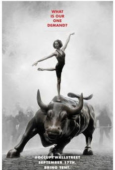 နယူးေယာက္တြင္ စီးပြားကပ္အရိပ္အေယာင္မ်ားအတြက္မေက်နပ္မႈမ်ားကို ဆႏၵျပျခင္း အရွိန္ဟုန္ျမင့္လာပါသည္။ ဥေရာပႏိုင္ငံမ်ားသို႔ျပန္႔ႏွံ႔သြားသည္။ Occupy Wall Street ဟုအမည္ေပးထားၾကသည္။ အျငင္းပြားဘြယ္ အထက္ပါပိုစတာမွာ စေတာ့ေစ်းကြက္ႏြားရိုင္းၾကီးေပၚ မွမိန္မငယ္ေလး၏ဘ၀၊ ေငြမစုဘဲ ရွယ္ယာစုေဆာင္းၾကေသာ အေမရိကန္မ်ား၏ ဘ၀မတည္ျငိမ္မႈကိုျပေနပါသည္။