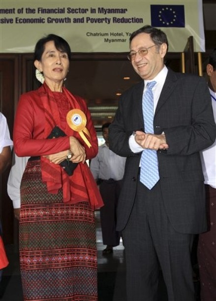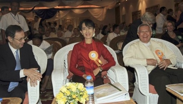 ရန္ကုန္ၿမိဳ႕တြင္ ယေန႔ ျပဳလုပ္ေသာ ဘ႑ာေရးဆုိင္ရာ ေဆြးေႏြးပဲြသုိ႔ တက္ေရာက္လာေသာ ေဒၚေအာင္ဆန္းစုၾကည္ (ဓာတ္ပုံမ်ား – AP)