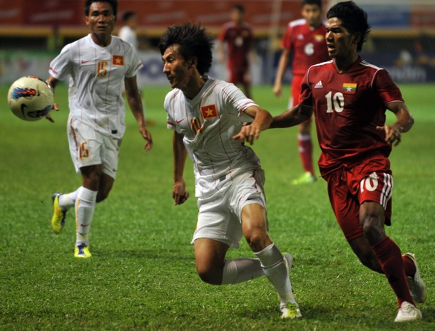 နုိ၀င္ဘာ ၅ ရက္ အေရွ႕ေတာင္အာရွ အားကစားျပဳိင္ပဲြ အုပ္စု(ခ)၏ ဗီယက္နမ္-ျမန္မာပဲြစဥ္တြင္ ေတြ႔ရေသာ ေက်ာ္ကုိကုိ (နံပတ္ ၁၀) (ဓာတ္ပုံ – Getty Images )