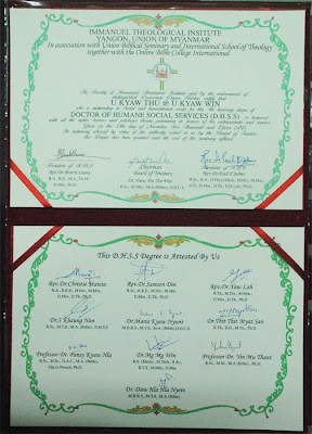 အထက္ေဖာ္ျပပါဘြဲ႔မ်ားကို IMMANUEL THEOLOGICAL INSTITUTE (ပင္မေက်ာင္းေတာ္ႀကီး)၊ UNION BIBLICAL SEMINARY (ရန္ကုန္)၊ INTERNATIONAL SCHOOL OF THEOLOGY (ဘန္ေကာက္)၊ ONLINE BIBLE COLLEGE INTERNATIONAL (ၾသစေၾတးလ်)တို႔မွ ေပးအပ္ခ်ီးျမႇင့္ ဂုဏ္ျပဳျခင္းျဖစ္သည္။
