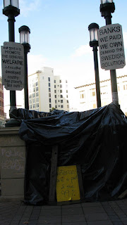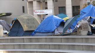 အခုအခ်ိန္္မွာေတာ့ အေမရိကန္သပိတ္စခန္းအံုၾကြမႈဟာကိုယ္ထူကိုယ္ထ ကိုယ့္အားကိုယ္ကုိးနဲ႔ ဆက္လက္ခ်ီတက္ဖို႔ လႈံေဆာ္စည္းရုံးေနဆဲ ျဖစ္ပါတယ္။အလုပ္လက္ရွိေတြက ေန႔တဓူ၀ အလုပ္သြား အလုပ္ျပန္နဲ႔ မအားၾကတဲ့အခ်ိန္မွာ၊ အလုပ္လက္မဲ့ေတြ၊ေက်ာင္းသား လူငယ္ေတြက အခ်ိန္ျပည့္ သပိတ္စခန္းမွာ ေနရာယူၾကရတယ္။ တက္ၾကြလႈပ္ရွားသူေတြနဲ႔အုပ္စုေတြကလည္း အခ်ိန္ပိုင္း သူတို႔သတ္မွတ္ထားႏိုင္သေလာက္ ၀င္ေရာက္အားျဖည့္ေတာင့္ခံေပးေနၾကတာကိုေတြ႔ရတယ္။ သပိတ္စခန္းမွာေတြ႔ရတဲ့ လူငယ္ေတြ၊ အိုးမဲ့အိမ္မဲ့ေတြ၊ ေက်ာင္းသားေတြ၊ တက္ၾကြလႈပ္ရွားသူေတြဟာရုပ္ရွင္ထဲက သိပၸံေခတ္ျမိဳ႔ပ်က္ၾကီးထဲက သရုပ္ေဆာင္ေတြလိုပဲ။ သတင္းစာေတြထဲမွာလည္း Occupier(သိမ္းပိုက္သူ) ဆိုတဲ့ အသုံးအစား Squatter က်ဴးေက်ာ္သူေတြလို႔ သုံးလာတာေတြကို ေတြ႔ေနရတယ္။