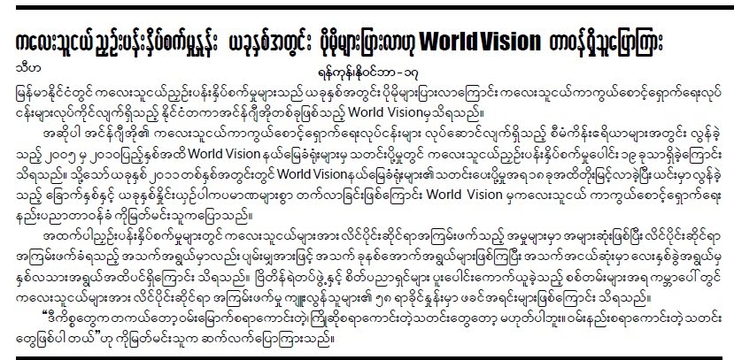 ျမန္မာျပည္က အသက္ ၇ ႏွစ္ေအာက္ ကေလးေတြ မေတာ္မတရားျပဳက်င့္ခံေနရတာ အေရအတြက္ ပုိမ်ားလာတယ္လုိ႔ နာမည္ႀကီး NGO တခုျဖစ္တ့ဲ World Vision က ေျပာလုိက္ပါတယ္။ သတင္းဆုိးတပုဒ္ပါပဲ။