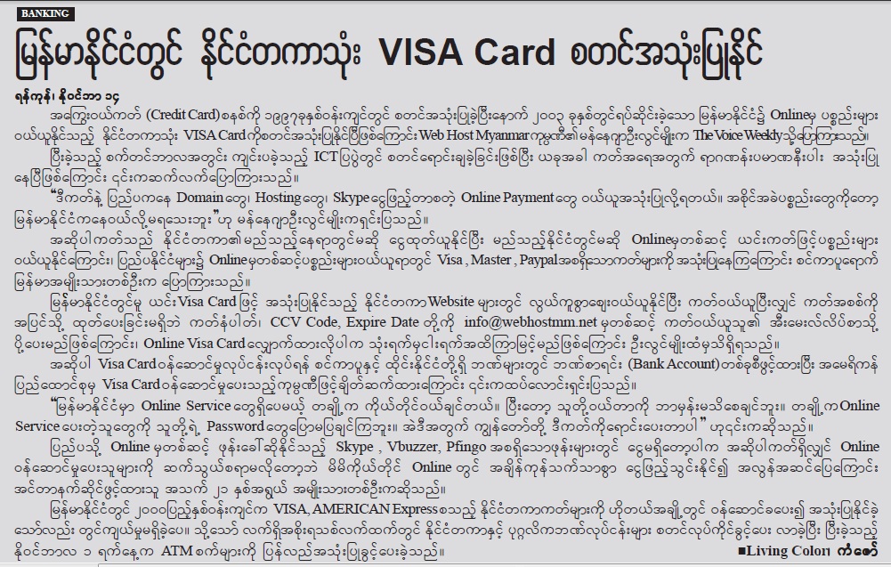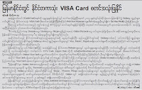 Visa ကတ္ ျမန္မာျပည္သားေတြ ေလွ်ာက္လုိ႔ရျပီ၊ ကတ္ေတာ့ မရဘူး ကတ္နံပါတ္ တုိ႔ exp date တုိ႔ပဲ ရမယ္ တ့ဲ။ ရေသ့စိတ္ေျဖကတ္လုိ႔ပဲ ဆုိရမယ္ ထင္ပါရဲ႕။ ဖြံ႔ျဖဳိးေရးကလည္း လိပ္သြားေလး သြားေနတယ္။ ဒုကၡပါပဲ လုိ႔ ညည္းရမလား၊ မဆုိးဘူးဟ ေရာင္ျခည္သမ္းေနျပီလုိ႔ အေကာင္းဘက္က ေတြးရမလား။ အဆင္ေျပသလုိသာ ေတြးၾကပါေလ။
