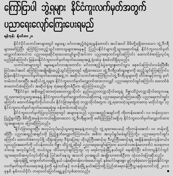 ျမန္မာျပည္ရဲ႕ လက္ရိွ အေျခခံဥပေဒ နဲ႔ ဒုိ႔တာ၀န္အေရး၃ပါး အင္မတန္ အေရးႀကီးပုံနဲ႔ နိဂုံးခ်ဳပ္ထားတ့ဲ အယ္ဒီတာ့ အာေဘာ္ပါ။ The Voice Weekly ရဲ႕ သတင္းေတြ မုိက္ပါတယ္ လန္းပါတယ္။ အယ္ဒီတာ့အာေဘာ္ကေတာ့ ဂြမ္းလြန္းတယ္။ ထုတ္ေ၀သူခင္ဗ်ာ … အယ္ဒီတာေတြကုိ ဒီအတုိင္း လႊတ္မထားပါနဲ႔။ ဒီလုိ ေပါက္ကရအာေဘာ္ေတြ ေရးေနတာ ခင္ဗ်ားရဲ႕ ဂ်ာနယ္ သိကၡာက်ပါတယ္။