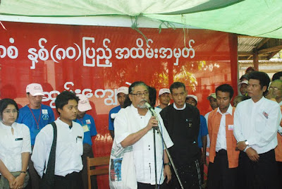 ယင္းေက်ာင္းတိုက္အတြင္း အမွတ္တရ ေက်ာက္စာတိုင္ စိုက္ထူခဲ့ၾကျခင္းျဖစ္ သည္။ ဦးေက်ာ္သူႏွင့္အဖြဲ႔ေရာက္႐ွိသြားခ်ိန္မွာေတာ့ အဆိုပါ ဆရာစံ က်ဆံုးျခင္း ႏွစ္ (၈၀) ျပည့္ အထိမ္းအမွတ္ပြဲ က်င္းပေရးအဖြဲ႔၏ ေမတၱာရပ္ခံ တိုက္တြန္းခ်က္အရ ဦးေက်ာ္သူက မွတ္မွတ္ရရ စကားေျပာၾကားရာမွာ “ကြၽန္ေတာ္ေျပာခ်င္တာက ကြၽန္ေတာ္တို႔အားလံုး လူစိတ္ေမြးၿပီး ကြၽန္ေတာ္တို႔ ျပည္သူ/သားေတြေရာ၊ ႏိုင္ငံေတာ္ အစိုးရကေရာ ဗုဒၶျမတ္စြာဘုရားေဟာၾကားထားတဲ့ ျဗဟၼစိုရ္တရားေလးပါးကို လက္ခံလုိက္နာၿပီးေတာ့ ခ်ီတက္သြားမယ္ဆိုရင္ အခုေလွ်ာက္ လွမ္းေနတဲ့ ဒီမိုကေရစီတိုင္းျပည္ကို အျမန္ဆံုးေရာက္ေရာက္လိမ့္မယ္လို႔ ကြၽန္ေတာ္ယံုၾကည္တယ္။ အဲဒီေတာ့ ကြၽန္ေတာ္တို႔ အဓိက လုပ္ကိုင္ေနတာက အမ်ားျပည္သူကို ကူညီေဖးမေပးဖို႔ပါပဲ။ ကြၽန္ေတာ္တို႔ဟာ တုိင္းျပည္ကိုသစၥာေဖာက္ေနတဲ့အဖြဲ႔မဟုတ္ဘူး။ အမ်ား ျပည္သူကို ကူညီေနတာျဖစ္ပါတယ္။ အရင္တုန္းက ကြၽန္ေတာ္တို႔ဟာ မသာခ်ေပးတဲ့ကိစၥကိုလုပ္တယ္။ မသာခ်ေပးရတာေတြ မ်ားလာေတာ့ ျပန္လည္သံုးသပ္လိုက္ေတာ့ က်န္းမာေရးခ်ဳိ႕ယြင္းမႈေတြေၾကာင့္က မ်ားေနတယ္။ အဲဒီအတြက္ေၾကာင့္ ေဆး၀ါးကုသဖို႔အတြက္ အခမဲ့ သုခကုသုိလ္ျဖစ္ေဆးခန္းဆိုတာကို ကြၽန္ေတာ္တို႔ ဖြင့္လွစ္ခဲ့တာျဖစ္ပါတယ္။ ကြၽန္ေတာ္တို႔အေနနဲ႔ သဘာ၀ေဘးအႏၲရာယ္ဒဏ္ေၾကာင့္ အခက္အခဲျဖစ္ေနသူေတြ နာဂစ္မုန္တိုင္းတို႔လို၊ ပခုကၠဴေရေဘးသင့္တာေတြတို႔လိုစတဲ့ အခက္အခဲျဖစ္ေနသူေတြကို ကြၽန္ေတာ္တို႔ တတ္ ႏိုင္သေလာက္ ကူညီေပးပါတယ္။