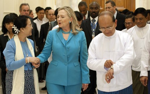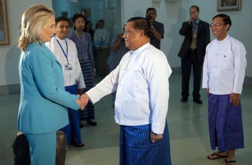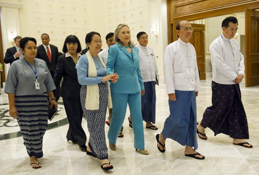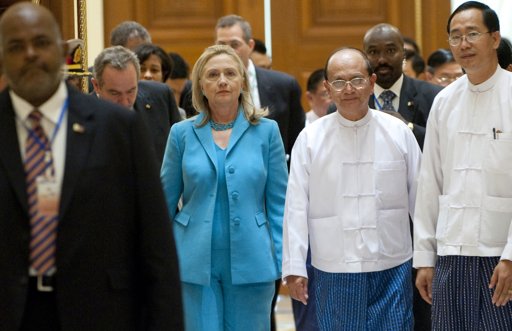 ေနျပည္ေတာ္တြင္ ေတြ႔ရေသာ ဟီလာရီ ႏွင့္ သမၼတ ဦးသိန္းစိန္ (ဓာတ္ပုံ AP- Saul Loeb sein)