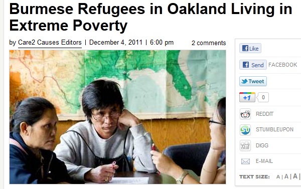 ကယ္လီဖုိးနီးယားျပည္နယ္ Oakland ျမိဳ႕တြင္ ျမန္မာျပည္မွ ဒုကၡသည္ အမ်ားအျပား ရိွရာ ၎တုိ႔အနက္မွ ၆၀ ရာခုိင္ႏႈန္းခန္႔မွာ အလြန္အမင္း ဆင္းရဲ ခ်ဳိ႕တဲ့ေနၾကသည္ဟု ယခုတပတ္အေစာပုိင္းက ထြက္ေပၚလာေသာ အစီရင္ခံစာတေစာင္တြင္ ေရးထားသည္။