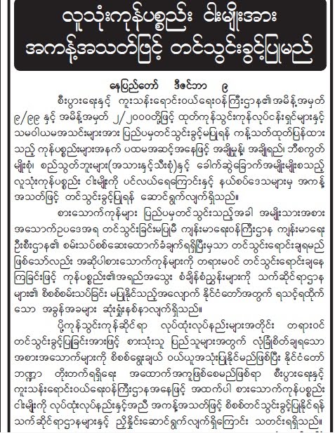 ေမွာင္ခုိ တင္သြင္းၾကသျဖင့္ “ကုန္ပစၥည္း၏ အရည္အေသြး စံခ်ိန္စံညႊန္းမ်ားကုိ သက္ဆုိင္ရာ ဌာနမ်ား၏ စိစစ္စမ္းသပ္ျခင္း မျပဳနုိင္သည့္ အေလ်ာက္ နုိင္ငံေတာ္အတြက္ ရသင့္ရထုိက္ေသာ အခြန္အခမ်ား ဆုံးရႈံးနစ္နာလ်က္ရိွသည္” ဟု ေရးထားသည္။