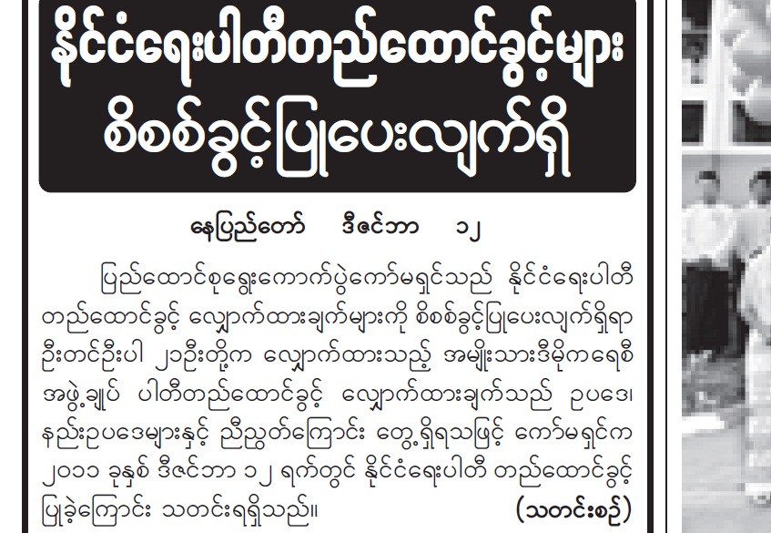 ေရြးေကာက္ပဲြ ေကာ္မရွင္က NLD ကုိ နုိင္ငံေရးပါတီအျဖစ္ အသိအမွတ္ျပဳလုိက္ေၾကာင္း ယေန႔ထုတ္ သတင္းစာမ်ားတြင္ အထက္ပါအတုိင္း ေရးထားသည္။ NLD သည္ ၁၉၉၀ ျပည့္ႏွစ္တြင္ ေတာင္ၿပိဳကမ္းၿပိဳ အႏုိင္ရခ့ဲေသာ္လည္း ထုိပဲြအျပီး အႏွစ္ ၂၀ အၾကာတြင္ အစုိးရက ပါတီကုိ တရားမ၀င္စာရင္း သြင္းလုိက္သည္။