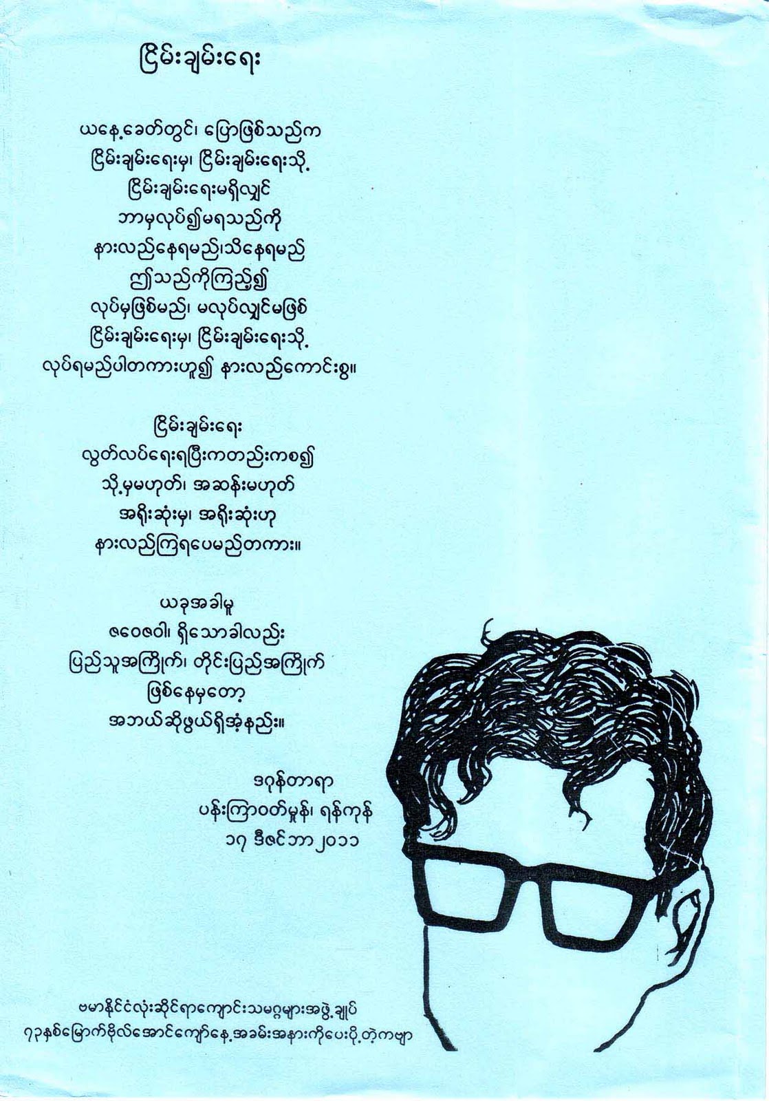 သူ၏ ၿငိမ္းခ်မ္းေရးကဗ်ာကုိ ကဗ်ာဆရာ ဦးအံ့ေမာင္မွ ရြတ္ဖတ္ခဲ့ပါတယ္။