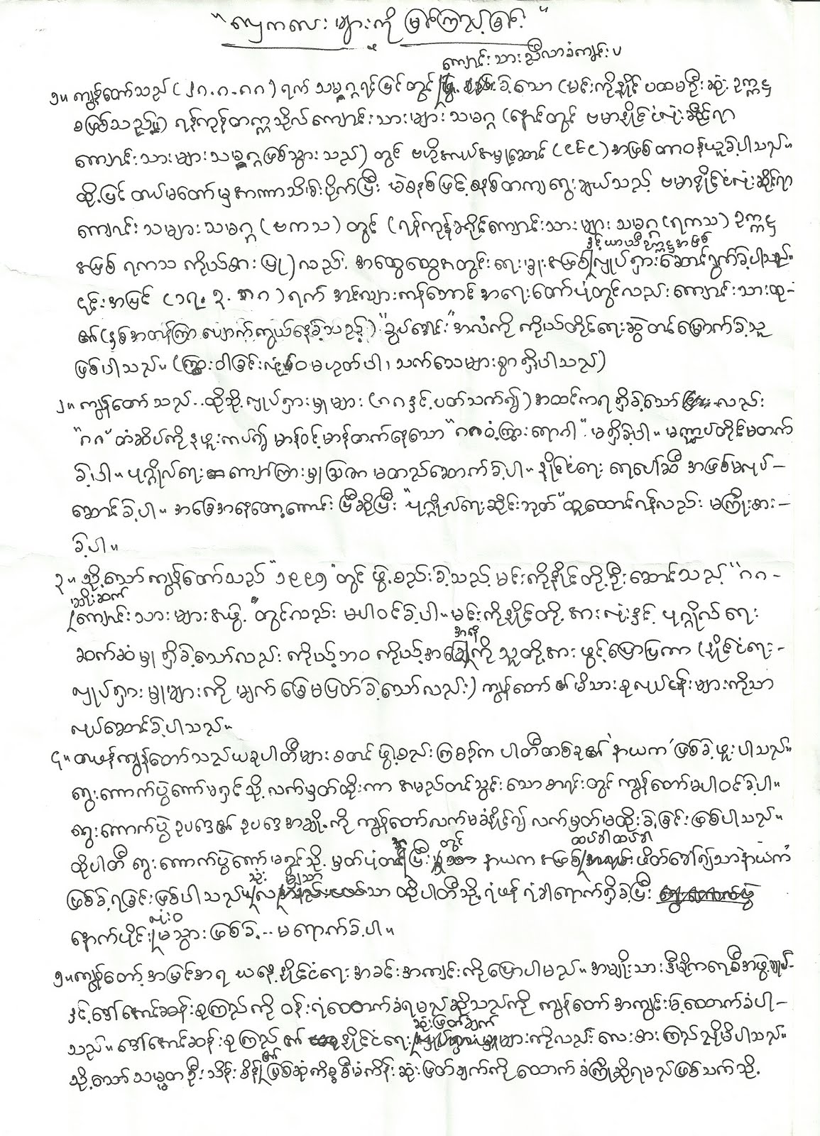 ၄။ တဖန္ ကြၽန္ေတာ္သည္ ယခုပါတီမ်ား စတင္ဖြဲ႔စည္းခဲ့ၾကစဥ္က ပါတီတစ္ခု၏ “နာယက” ျဖစ္ခဲဖူးပါသည္။ ေရြးေကာက္ပြဲ ေကာ္မရွင္သုိ႔ လက္မွတ္ထုိးကာ အမည္တင္သြင္းေသာစာရင္းတြင္ ကြၽန္ေတာ္ မပါဝင္ခဲ့ပါ။ ေရြးေကာက္ပြဲဥပေဒ၏ ဥပေဒအခ်ိဳ႕ ကုိ ကြၽန္ေတာ္လက္မခံႏုိင္၍ လက္မွတ္မထုိးခဲ့ျခင္းျဖစ္ပါသည္။ ထုိပါတီေရြးေကာက္ပြဲေကာ္မရွင္သုိ႔ မွတ္ပုံတင္အၿပီးတြင္ နာယကအျဖစ္ ထပ္ခါထပ္ခါဖိတ္ေခၚ၍သာ နာယကျဖစ္ခဲ့ရျခင္း ျဖစ္ပါသည္။ သုံးလမွ်သာ ထုိပါတီသုိ႔ ရံဖန္ရံခါေရာက္ရွိခဲ့ၿပီး ေနာက္ပုိင္း လုံးဝမသြားျဖစ္ခဲ့ပါ။ မေရာက္ခဲ့ပါ။