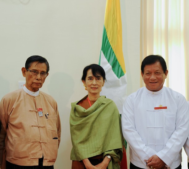 ဒီဇင္ဘာ ၂၃ ရက္ေန႔က ေတြ႔ရေသာ ဦးတင္ဦး၊ ေဒၚေအာင္ဆန္းစုၾကည္၊ ေရြးေကာ္မရွင္ ဥကၠ႒ ဦးတင္ေအး (ဓာတ္ပုံ – Getty Images)