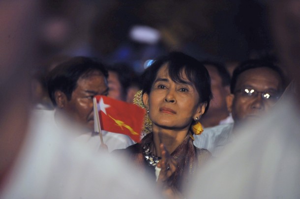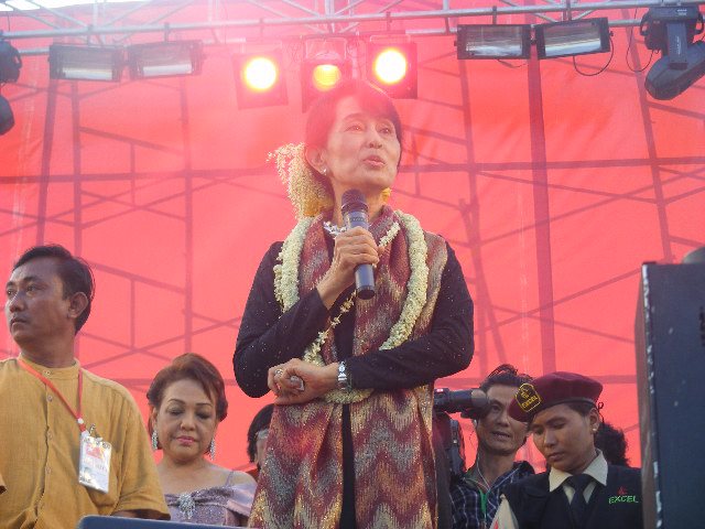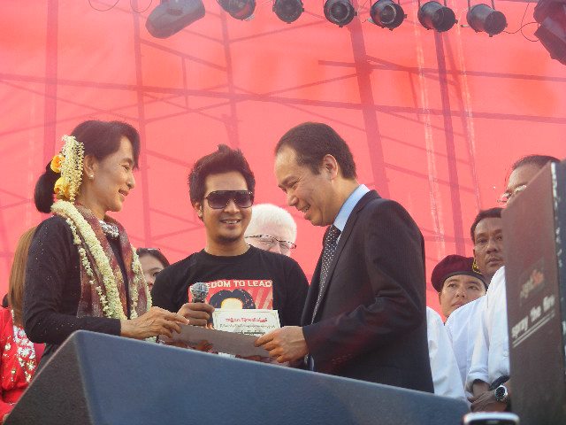 ေဒၚေအာင္ဆန္းစုၾကည္ႏွင့္ ဖြင္႔ပြဲတြင္ အလွဴေငြေပးအပ္ေသာ ေရႊနန္းေတာ္ေရႊဆိုင္ ပုိင္ရွင္ (ဓာတ္ပုံ ျမစ္မခ)