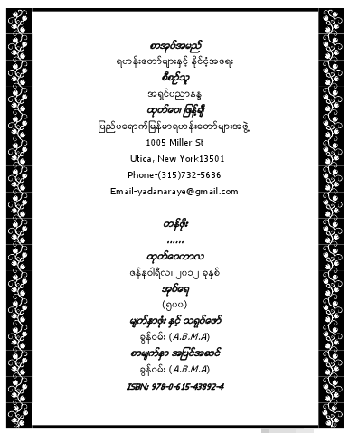 “ဒီေဆာင္းပါးေပါင္းခ်ဳပ္ကိုုျမန္မာဘာသာနဲ႔ ၂၀၁၀ ခုုႏွစ္ကတည္းက စီစဥ္ထုုတ္ေ၀ခဲ့တယ္။ အခက္အခဲေတြအမ်ဳိးမ်ဳးိေၾကာင့္ ပုုံႏွိပ္စာအုုပ္အျဖစ္ ထြက္လာခဲ့ေသာ္လည္း အဂၤလိပ္ဘာသာျပန္ကိုုဆက္တိုုက္ မထြက္ႏိုုင္ခဲ့ဘူး။ အခုုေတာ့ အားလုုံးက ဆက္ျပီး အားေပးကူညီၾကလိုု႔အဂၤလိပ္ဘာသာစာအုုပ္အျဖစ္ ထြက္လာႏိုုင္ျပီ။ ကူညီၾကသူေတြအားလုုံးကိုု ဆရာေတာ္ကေက်းဇူးတင္ပါတယ္။ အမွားအယြင္းေတြ အားနည္းတာေတြ ေတြ႔ရင္ ဆရာေတာ္ကိုုေထာက္ျပေ၀ဖန္ပါ။ ဆက္ျပီး ျပည့္စုုံေအာင္ ၾကိဳးစားပါမယ္။ ျမန္မာျပည္က အမ်ဳိး ဘာသာသာသနာကိုု အသက္စြန္႔ျပီး ေစာင့္ေရွာက္တဲ့ သာသနာ့အာဇာနည္ေတြအားလုုံး၊အက်ဥ္းက်ခဲ့တဲ့၊ အက်ဥ္းက်ေနဆဲ သံဃာေတာ္ေတြအားလုုံးကိုု တပည့္ေတာ္ ဒီကေနဂုုဏ္ျပဳလိုုက္ပါတယ္ ဘုုရားလိုု႔ ေလ်ာက္ေပးပါ”