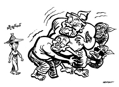 ဖြတ္ကေလး တစ္ေယာက္ ေဆးရံုုႀကီးဘက္သိုု႔ ေျခဦးလွည္႔ရင္း ဒီတစ္ခါ ယုုန္ကန္ ေဆးရံုုအသစ္ ေဆာက္ရန္အတြက္ အကူအညီေပးရန္ ဂ်ပံဂ်ီးမ်ား လာလွွ်င္ေတာ႔ျဖင္႔ “ရုုပ္ကိုုဆိုုး” ဟုု ႀကိဳဆိုုလိုုက္ျပီး၊ “ေကာ္နီ ခ်ီး၀ါး”ဟုု ႏွဳတ္ဆက္လိုုက္မည္။ ယုုန္ကန္ေဆးရံုုႀကီးမွ ဆရာသမား အုုပ္ကေလး ႏွင္႔ အုုပ္ႀကီးမ်ား ကိုုေတာ႔ ႏွစ္ကူးမွာ “စုုခ်ီး” အဲ…. “ဆုုရွီး” ေကၽြးျပီး ကန္ေတာ႔လိုုက္ရင္ ေကာင္းမလား ေတြးမိကာ တစ္ေယာက္တည္း ႀကိတ္ျပီး ျပံဳးမိေလေတာ႔သတည္း။ ။