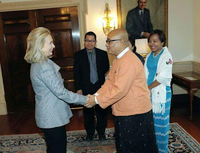 ေဖေဖာ္၀ါရီ ၈၊ ေန႔ခင္း၊ ၀ါရွင္တန္ဒီစီ အစုုိးရရုုံးေတာ္တြင္ ျမန္မာျပည္က ေခတၱလာေရာက္သူ ႏိုုင္ငံအေရး ႏိုုးၾကားလႈပ္ရွားသူမ်ားျဖစ္သည္ ကိုုဇာဂနာ၊ ေဒၚေဘာက္ဂ်ာႏွင့္ ေဒၚခင္သန္းျမင့္တိုု႔ကိုု အစုုိးရႏိုုင္ငံျခားေရး၀န္ၾကီး ဟယ္လရီကလင္တန္က လက္ခံေတြ႔ဆုုံခဲ့သည္ကိုု ေတြ႔ရစဥ္။