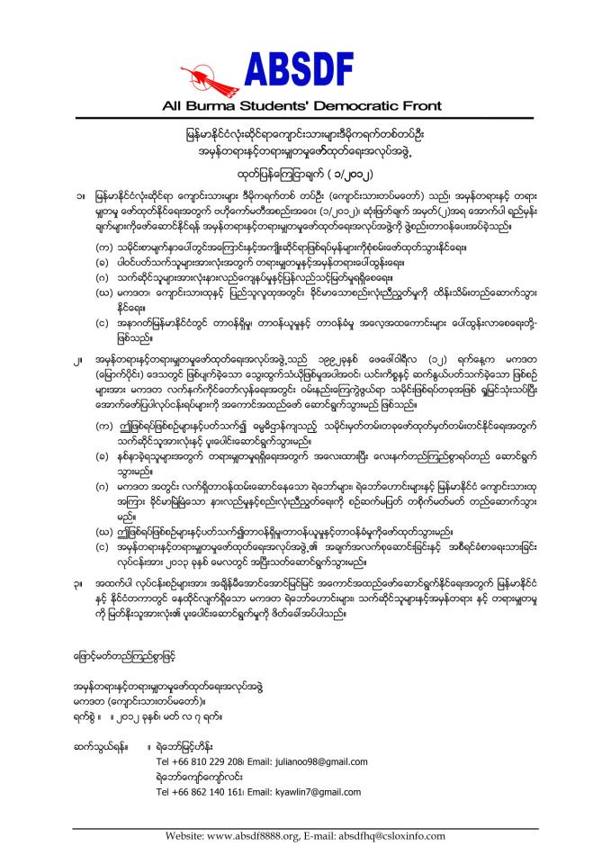 ျဖစ္ရပ္မွန္ေဖာ္ထုတ္ေရးအတြက္ အလုပ္အဖဲြ႔တခု ဖဲြ႔စည္း တာ၀န္ေပးအပ္သြားမည္ဟု ABSDF က ေၾကညာခ့ဲျပီး ယခု အလုပ္အဖဲြ႔၏ လုပ္ငန္းမ်ား အေၾကာင္း ထုတ္ျပန္လုိက္ျခင္း ျဖစ္သည္။