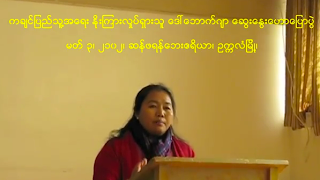 ကခ်င္ျပည္သူတိုု႔အေရး လႈပ္ရွားေဆာင္ရြက္ေနသူ ကခ်င္အမ်ဳိးသမီး ေဒၚေဘာက္ဂ်ာသည္ အေမရိကန္ျပည္ေထာင္စုုသိုု႔ NED အဖြဲ႔ၾကီး၏ ဖိတ္ၾကားခ်က္ျဖင့္ အလည္အပတ္ေရာက္ရွိေနရာ မတ္လ ၃ ရက္ေန႔က ဥကၠလံျမိဳ႔၊ ျမန္မာတိုုင္းရင္းသားတိုု႔၏ ခရစ္ယာန္ဘုုရားရွိခိုုးေက်ာင္းေတာ္တြင္ ေန႔ခင္း ၁၁ နာရီမွ ၂ နာရီအထိ ကြန္ျမဳနီတီေတြ႔ဆုုံပြဲ က်င္းပခဲ့သည္။ ေတြ႔ဆုုံပြဲကိုု Kachin Heritage Foundation က စီစဥ္ခဲ့ျပီး စိတ္၀င္စားသူ ျမန္မာတိုုင္းရင္းသားတိုု႔ တက္ေရာက္ၾကသည္။ ေဟာေျပာခ်က္ ရုုပ္သံမွတ္တမ္းကိုု တင္ဆက္လိုုက္ပါသည္။