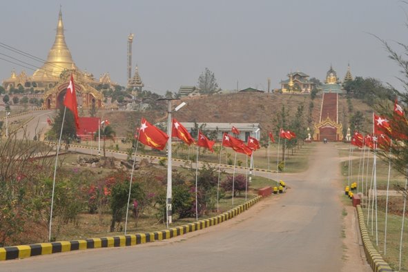 တနဂၤေႏြေန႔တြင္ ျပဳလုပ္မည့္ ေဒၚေအာင္ဆန္းစုၾကည္၏ လားရႈိးၿမိဳ႕ ေဟာေျပာပဲြအတြက္ ရန္တိုင္းေအာင္ ဆုေတာင္းၿပည့္ ျမိဳ႕ဦး ေစတီ အနီးတြင္ ျပင္ဆင္ထားသည္ (ဓာတ္ပံုမ်ား – ဆိုင္းဆြတ္/Yangon Press International)