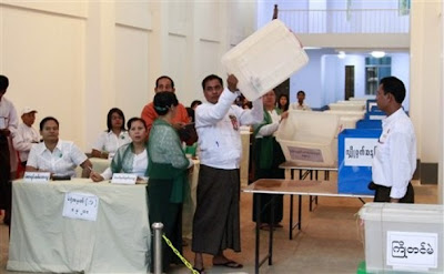 ဧျပီ ၁၊ ၂၀၁၂ယေန႔ နံနက္ပုိင္းက ရန္ကုန္ျမိဳ႕ မဂၤလာေတာင္ညြန္႔ ျမိဳ႕နယ္ရိွ မဲရုံတခုတြင္ မဲေပးေနေသာ အမ်ဳိးသမီးတဦး (ဓာတ္ပုံမ်ား – AP)မဲေပးမႈ မစတင္မီ မဲပုံးကုိ ဖြင့္ျပေနေသာ မဂၤလာေတာင္ညြန္႔ မဲရုံတခုမွ ၀န္ထမ္းမ်ား