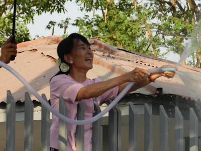 အေမစုတေယာက္ အတာသႀကၤန္ေရပက္ေနတာ ေတြ.လိုက္ရတာ ႀကည္ႏူးမိတယ္ဗ်ာ။ဒီႏွစ္ကူးသႀကၤန္မွာ ေအးျမေသာေရစင္နဲ.ပက္ျဖန္းေနတဲ့ ဒီမိုကေ၇စီ၇ဲ.မိခင္ အေမစု၇ဲ.လက္ဟာ ႏွစ္သစ္မွာ တိုင္းျပည္ႀကီးေအးခ်မ္းေအာင္ တ၇ားမွ်တမွဳ ကိုယ္ပိုင္လူမွဳအခြင့္အေ၇းဆိုတဲ့ ဒီမိုကေရစီကို ရေအာင္ဖန္တီးမယ္ဆိုတဲ့ အတိတ္နမိတ္ ပုံရိပ္တခုပါဘဲ။