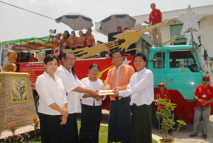 အေၾကာင္းမွာ အမ်ိဳးသားဒီမိုကေရစီအဖြဲ႔ခ်ဳပ္၏ BG ေသြးလွဴအဖြဲ႔၏ အလွျပေဖ်ာ္ေျဖေရး ေမာ္ေတာ္ယာဥ္ႀကီးသည္ နာေရးကူညီမႈအသင္း (ရန္ကုန္) သို႔၀င္ေရာက္ခဲ့ကာ ေဖ်ာ္ေျဖသီဆိုမႈတို႔ကို ျပဳလုပ္ခဲ့ျခင္းေၾကာင့္ျဖစ္သည္။ “တို႔တိုင္းဌာနီ NLD၊ ေဒါင္းပ်ဳိမာတာ ပိေတာက္ဋိကာ၊ ခြပ္ေဒါင္းျပဌာန္းသစ္၊ ခြပ္ေဒါင္းသႀကၤန္၊ အိုးေ၀တြန္သံ၊ BG သႀကၤန္အိုးေ၀သံ၊ ၾကည္ျမစိမ္းစို ခြပ္ေဒါင္းပ်ိဳ” စသည့္သီခ်င္းမ်ားအျပင္ နာေရးကူ ညီမႈအသင္း (ရန္ကုန္) အသင္းသူ/သားတို႔၏ ေတာင္းဆိုခ်က္ေၾကာင့္ “ခြပ္ေဒါင္း ျပန္လာၿပီ” သီခ်င္းအား ၿမိဳင္ဆိုင္သီဆို ကျပေဖ်ာ္ေျဖခဲ့ၾက သည္။ နာေရးကူညီမႈအသင္း (ရန္ကုန္) မွ အသင္းသူ/သားမ်ား၊ ၀န္ထမ္းမ်ားသည္လည္း ၀မ္းသာၾကည္ႏူးစြာျဖင့္ ၀င္ေရာက္ကျပၾကသည္။ နာေရးကူညီမႈအသင္း (ရန္ကုန္) မွ အသင္းသား ဦးေ႒းလြင္မွ ဂုဏ္ျပဳေငြ (တစ္ေသာင္း) က်ပ္၊ အသင္းသူ မျပားလီမွ ဂုဏ္ျပဳေငြ (ႏွစ္ေသာင္း)က်ပ္၊ ဥကၠ႒ ဦးေက်ာ္သူႏွင့္ဇနီး ေဒၚေရႊဇီးကြက္တို႔မွ (ငါးေသာင္း) က်ပ္အျပင္ နာေရးကူညီမႈအသင္း (ရန္ကုန္) မွ အလွဴေငြ (တစ္သိန္း) က်ပ္တို႔အား ခ်ီးျမႇင့္ေပးၾကကာ အမ်ိဳးသားဒီမိုကေရစီအဖြဲ႔ခ်ဳပ္ BG ေသြးလွဴအဖြဲ႔ အလွျပေဖ်ာ္ေျဖေရး အဖြဲ႔သား/သူ အေယာက္ (၄၀) ေက်ာ္ တို႔အား ထမင္းဟင္းမ်ားျဖင့္ ဧည္႔ခံေကြၽးေမြးခဲ့သည္။ ထိုသို႔သီဆိုေဖ်ာ္ေျဖမႈအား အသင္းသား/သူမ်ား၊ ၀န္ထမ္းမ်ားအျပင္ ျပင္ပမွဧည့္ပရိ သတ္္မ်ားပါ လာေရာက္အားေပးၾကည့္႐ႈခဲ့ၾကသည္။ BG ေသြးလွဴအဖြဲ႔ အလွျပေဖ်ာ္ေျဖေရးေမာ္ေတာ္ယာဥ္ထြက္ခြာသြားစဥ္၌ အဖြဲ႔သား/သူ မ်ား အတြင္းေရးမွဴးေဒၚေရႊဇီးကြက္ႏွင့္ နာေရးကူညီမႈအသင္း (ရန္ကုန္) အသင္းသား/သူမ်ားတို႔သည္ BG အဖြဲ႔သား/သူမ်ားတို႔အား သႀကၤန္ ေရ ပက္ဖ်န္းေလာင္းခဲ့သည္။