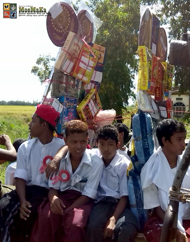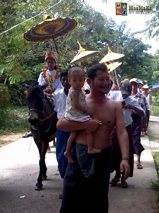 ရဟန္းခံရွင္ျပဳ အလွဴလွည့္ျခင္းကုိလည္း ရုိးရာအစဥ္အလာအတုိင္း ေတြ႔ခ့ဲရသည္။ ကုိရင္၀တ္မည့္သူမ်ားကုိ ျမင္းေပၚတင္၊ ရဟန္းခံမည့္သူမ်ားကုိ ဆုိက္ကားေပၚတင္ၿပီး လွည့္လည္ေနၾကသည္ကုိ ပုံတြင္ ေတြ႔ရိွႏုိင္သည္။ ဓာတ္ပုံမ်ား – ရန္ေနာင္ (ဗုိလ္တေထာင္)