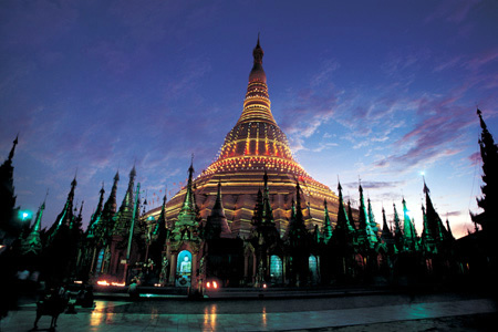 Shwedagon Pagoda in Yangon, the largest city in Myanmar, has attracted many people over the years to admire its beauty. More than three metric tons of gilts and gold plates are attached to the surface of the 99-meter-high structure. They are far heavier than those attached to Kinkakuji Temple in Kyoto, which weigh 20 kilograms.