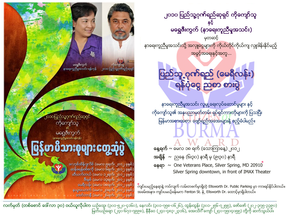 ျပည္သူ႔ဂုဏ္ရည္ ရန္ပံုေငြ ညစာစားပြဲ နဲ႔ အထူးဧည္သည္ေတာ္ ကိုေက်ာ္သူ၊ မေရႊဇီးကြက္တို႔နဲ႔ ေတြ႔ဆံုပြဲ အခမ္းအနားကို မယ္ရီလန္းျပည္နယ္ Silver Spring ၿမိဳ ႔လယ္ ဧည္ခန္းမမွာ က်င္းပျပဳလုပ္သြားပါမယ္။ အခမ္းအနားကို ညေန (၆း၃၀) မွာ ဖြင့္လွစ္ၿပီး ႏႈတ္ခြန္းဆက္စကားေျပာၾကားျခင္း၊ ျပည္သူ႔ဂုဏ္ရည္အေၾကာင္း ရွင္းလင္းမိတ္ဆက္ ေျပာဆုိျခင္း၊ ညေနစာ စားသံုးျခင္း၊ ကိုေက်ာ္သူ၏ အႏုပညာ ဘဝဇာတ္ေၾကာင္း နဲ႔ နာေရးကူညီမႈအသင္းအေၾကာင္း မွတ္တမ္းရုပ္ရွင္မ်ား ျပသျခင္း၊ ကိုေက်ာ္သူ နဲ႔ မေရႊဇီးကြက္ တုိ႔က နာေရးကူညီမႈအသင္း