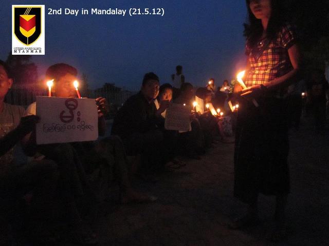 ပူအုိက္ေျခာက္ေသြ႔သည့္ မႏၱေလးတြင္ လွ်ပ္စစ္မီး ပုံမွန္ရရိွေရးအတြက္ ဖေယာင္းတုိင္မ်ား ထြန္းညိွျပီး ဆႏၵေဖာ္ထုတ္ျခင္းကုိ ယေန႔ ဒုတိယညအျဖစ္ ဆက္လက္ ျပဳလုပ္ခ့ဲၾကသည္။အစုိးရသတ္မွတ္ထားသည့္အခ်ိန္မ်ားတြင္ လွ်ပ္စစ္ဓာတ္အား အမွန္တကယ္ ျဖန္႔ျဖဴးေပးေရးကုိ လုိလားသည္ဟု ဆႏၵျပသူမ်ားက ဆုိသည္။ (ဓာတ္ပုံမ်ား – www.facebook.com/CJMyanmar)