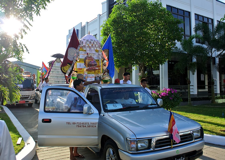၁၆.၁၁.၂ဝ၁၃ ရက္ေန႔ နံနက္ (၇း၃ဝ) နာရီအခ်ိန္တြင္ ပေဒသာပင္စုစုေပါင္း (၂၁) ပင္တုိ႔အား ေမာ္ ေတာ္ယာဥ္ (၂၈) စီးတို႔ျဖင့္ စီတန္း၍ အသင္းသား/သူမ်ား၊ လွဴ႐ွင္မ်ား၊ ေခတ္သစ္ေ႐ွ႕ေဆာင္ ေဇယ်ာ ေအာင္ (သံစဥ္ဒိုးအဖြဲ႔)၊ ေအာင္ေမတၱာ႐ွင္ (႐ွမ္းဒိုးအဖြဲ႔) တို႔မွ အားျဖည့္ကူညီ တီးခတ္၍ ရန္ကုန္ၿမိဳ႕တြင္း ဆူးေလေစတီေတာ္ျမတ္ႏွင့္ ေ႐ႊတိဂံုေစတီေတာ္ျမတ္တို႔အား လွည့္လည္ခဲ့ၿပီးေနာက္ နံနက္ (၁ဝးဝဝ) နာရီ အခ်ိန္တြင္ နာေရးကူညီမႈအသင္း(ရန္ကုန္)သို႔ ျပန္လည္ေရာက္႐ွိခဲ့ၾကသည္။ ကထိန္လ်ာျမတ္သကၤန္း အား ရန္ေအာင္ျမင္ေက်ာင္းတိုက္ ဝဋ္ေၾကြးေတာ္ ေျပဆရာေတာ္ ဘဒၵႏၲသီရိပါလ ထံသို႔ ဆပ္ကပ္၍ လွဴဒါန္းမႈအစုစုတို႔အတြက္ ေရစက္သြန္းခ် လွဴဒါန္းခဲ့ၿပီး ၾကြေရာက္လာၾကေသာ သံဃာေတာ္ အ႐ွင္သူ ျမတ္အေပါင္းတို႔အား ေန႔ဆြမ္းဆပ္ကပ္ လွဴဒါန္းခဲ့သည္။ ပေဒသာပင္မ်ားအား ရန္ကုန္ၿမိဳ႕၊ ေျမာက္ဒဂံုၿမိဳ႕ နယ္႐ွိ ရန္ေအာင္ျမင္ေက်ာင္းတိုက္ (ဝဋ္ေၾကြးေတာ္ေျပ)သို႔ ကထိန္ပေဒသာပင္တန္ဖိုး – ၁၁၈၃၁ဝဝိ/- (တစ္ဆယ့္တစ္သိန္း႐ွစ္ေသာင္း သံုးေထာင့္တစ္ရာ) က်ပ္တိတိ၊ ရန္ကုန္ၿမိ႕၊ ဒဂံုအေ႐ွ႕ပိုင္းၿမိဳ႕နယ္႐ွိ သိရီမဂၤလာမဟာစည္ရိပ္သာေက်ာင္းတိုက္သို႔ ကထိန္ပေဒသာပင္တန္ဖိုး – ၆၂၇၇ဝဝိ/- (ေျခာက္ သိန္းႏွစ္ ေသာင္းခုႏွစ္ေထာင္ခုႏွစ္ရာ) က်ပ္တိတိ၊ ျပည္ၿမိဳ႕၊ နဝေဒးရပ္႐ွိ ေ႐ႊေပါက္ပင္ေက်ာင္းတိုက္သို႔ ကထိန္ ပေဒသာပင္တန္ဖိုး – ၅၉၄ဝဝဝိ/- (ငါးသိန္းကိုးေသာင္းေလးေထာင္) က်ပ္တိတိ၊ မႏၲေလးတိုင္း၊ ေက်ာက္ ပန္းေတာင္း ၿမိဳ႕နယ္႐ွိ ကၽြတ္လြတ္ေအာင္ေျမ ဝဋ္ေၾကြးေတာ္ေျပေက်ာင္းတိုက္သို႔ ကထိန္ပေဒသာပင္ တန္ဖိုး – ၄၄၈ဝဝဝိ/- (ေလးသိန္းေလးေသာင္း႐ွစ္ေထာင္) က်ပ္တိတိ၊ ဖ်ာပံုၿမိဳ႕၊ ဆိပ္မႀကီးေက်း႐ြာ႐ွိ သာဓုမာနိတ ဘုန္းေတာ္ႀကီးသင္ပညာေရးေက်ာင္းသို႔ ကထိန္ပေဒသာပင္တန္ဖိုး – ၄ဝ၁၅၁၅ိ/-(ေလးသိန္း တစ္ေထာင့္ငါးရာတစ္ဆယ့္ငါး) က်ပ္တိတိ၊ ဖ်ာပံုၿမိဳ႕၊ အႀကီးဝေက်း႐ြာ႐ွိ ပညာဒီပ ဘုန္းေတာ္ႀကီးသင္ ပညာေရးေက်ာင္းသို႔ ကထိန္ပေဒသာပင္တန္ဖိုး – ၆၆၄၈၅ဝိ/- (ေျခာက္သိန္းေျခာက္ေသာင္းေလးေထာင္ ႐ွစ္ရာ့ငါးဆယ္) က်ပ္တိတိ စုစုေပါင္းတန္ဖိုး – ၃၉၁၉၁၆၅ိ/- (သံုး ဆယ့္ကိုးသိန္းတစ္ေသာင္းကိုးေထာင္ တစ္ရာေျခာက္ဆယ့္ငါး) က်ပ္တိတိတို႔အား အစ႐ွိသည့္ ေက်ာင္းတိုက္မ်ားသို႔ မဲႏိႈက္၍ အသီးသီး ခြဲေဝ ဆပ္ကပ္ၿပီး လွဴဒါန္းဖြယ္ပစၥည္းမ်ားအား ေက်ာင္းတိုက္မ်ားသုိ႔ ပို႔ေဆာင္ေပးခဲ့ပါသည္။