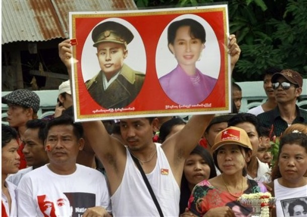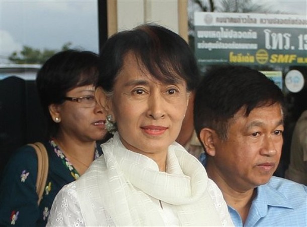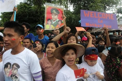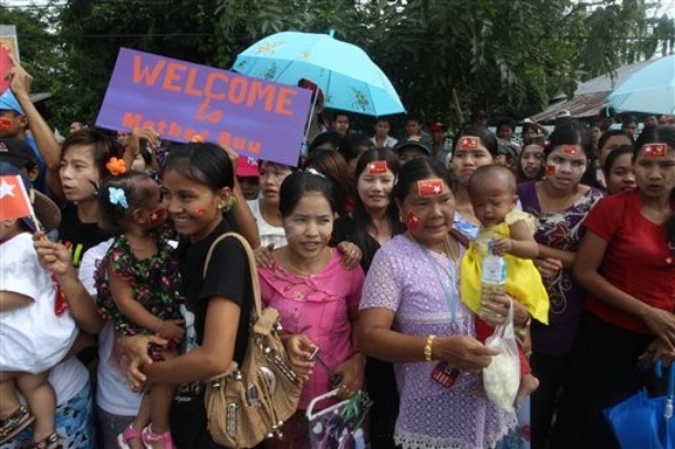 (ဓာတ္ပုံမ်ား – AP)ေဒၚေအာင္ဆန္းစုၾကည္ ယေန႔ နံနက္ မဲေဆာက္ျမိဳ႕သုိ႔ ေရာက္ရိွသြားရာ ျမန္မာျပည္သား အမ်ားအျပားက ၀မ္းသာအားရ ႀကိဳဆုိခ့ဲၾကသည္။