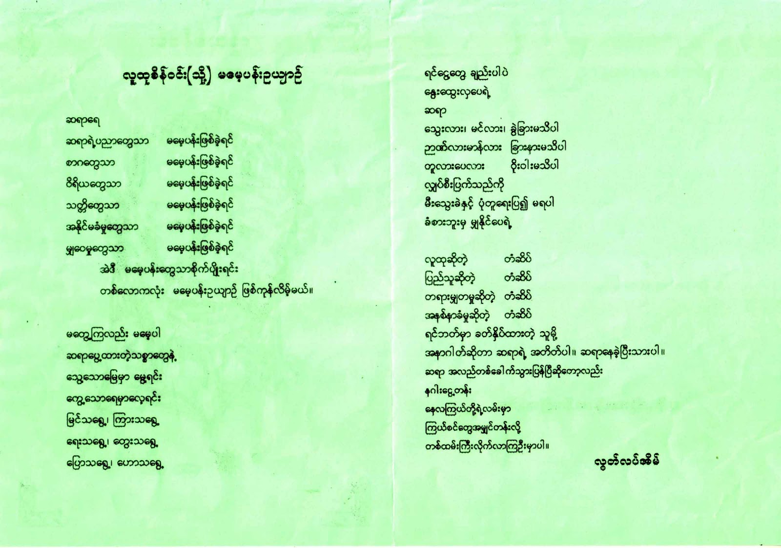 ကြယ္လြန္သူကို ရည္စူးျပီး ဇြန္ ၂၃ ၂၀၁၂ စေနေန႔၊ နံနက္ ၇ နာရီက ၁၀ နာရီအထိ ရက္လည္ဆြမ္းေကၽြး တရားေတာ္နာမွာ ျဖစ္တဲ့အတြက္ အမွတ္ ၅၀၁၊ ပထပ္၊ ကုန္သည္လမ္း၊ ၃၉လမ္းထိပ္၊ ေက်ာက္တံတားျမိဳ႔နယ္ ေနအိမ္သို႔ ၾကြေရာက္ၾကပါရန္ က်န္ရစ္သူမိသားစုက ဖိတ္ၾကားထားေၾကာင္း သတင္းရရိွပါတယ္။