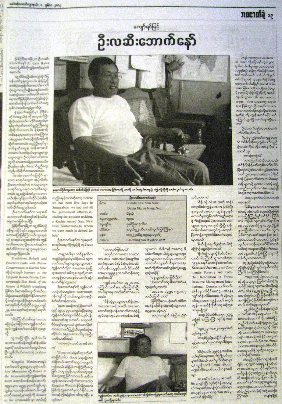သဘာ၀ပတ္၀န္းက်င္ထိန္းသိမ္းေရး လႈံ႔ေဆာ္ရတာ အခုမွ ပုိျပီး လြယ္ကူလာတယ္လုိ႔ ဆုိသူနဲ႔ ဗ်ဴးထားတာပါ။ သူက ဒီအေၾကာင္းအရာကုိ ေလ့လာထားသူ၊ စာအုပ္ေတြလည္း ေရးေနသူပါ။ YMCA မွာ ဥကၠ႒ အၾကာၾကီး လုပ္ခ့ဲတယ္၊ ၁၉၉၄ KIA အပစ္ရပ္ စာခ်ဳပ္ခ်ဳပ္ရာမွာလည္း သူ ပါ၀င္ခ့ဲတယ္ တ့ဲ။