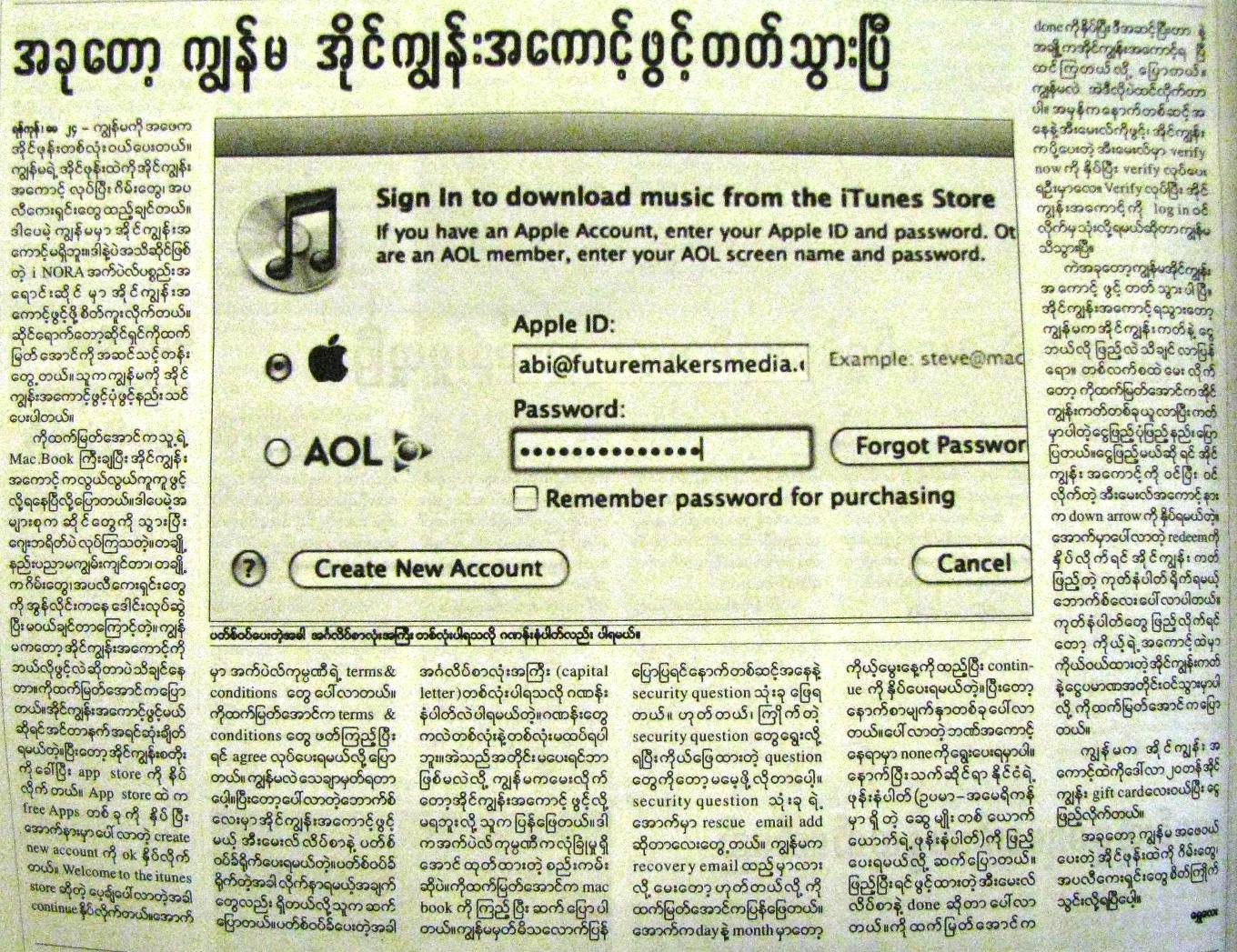 iTune အေကာင့္တခု ဘယ္လုိဖြင့္ရတယ္ ဆုိတာကုိ ရွင္းျပထားပါတယ္။ လုိက္မလုပ္နုိင္ဘူး ဆုိရင္ေတာင္မွာ ဒီလို္ အဆင့္ဆင့္လုပ္ရတာပါလား ဆုိတာ နားလည္သြားနုိင္တ့ဲ ေဆာင္းပါးတုိေလးပါ။