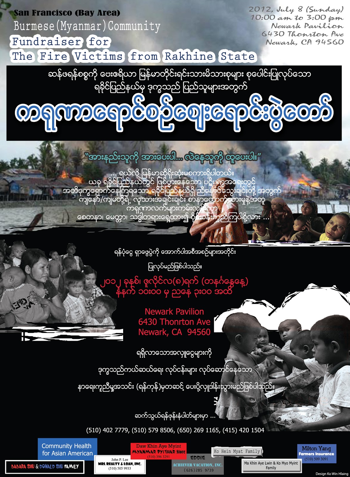 လာမည္ ဇူလိုင္လ ၈၊ က်င္းပေနၾက Newark Pavilion, Thornton Ave, East Bay ကြန္ျမဴနီတီရိပ္သာတြင္ မနက္ ၁၀ နာရီမွ ညေန ၃ နာရီအထိ္ ျမန္မာႏွင့္ အာရွရိုးရာ စားေသာက္ဖြယ္ ေစ်းပြဲေတာ္ က်င္းပျပီး လက္ခံရရွိေသာ ေစ်းေရာင္းရေငြအားလုံးကို ျမန္မာျပည္တြင္းရွိ ရခုိင္ျပည္သူမ်ားကို အားေပးကူညီေနေသာ နာေရးကူညီမႈအသင္း (ရန္ကုန္)အဖြဲ႔ၾကီးကို အမွဴးျပဳျပီး လွဴဒါန္းမည္ ျဖစ္သည္။