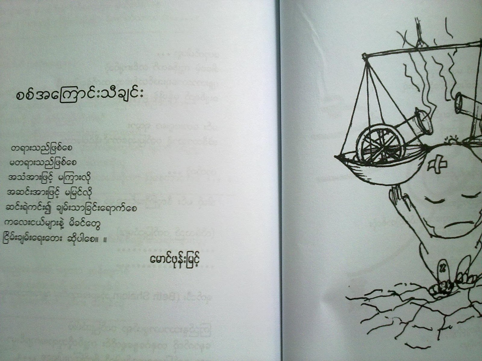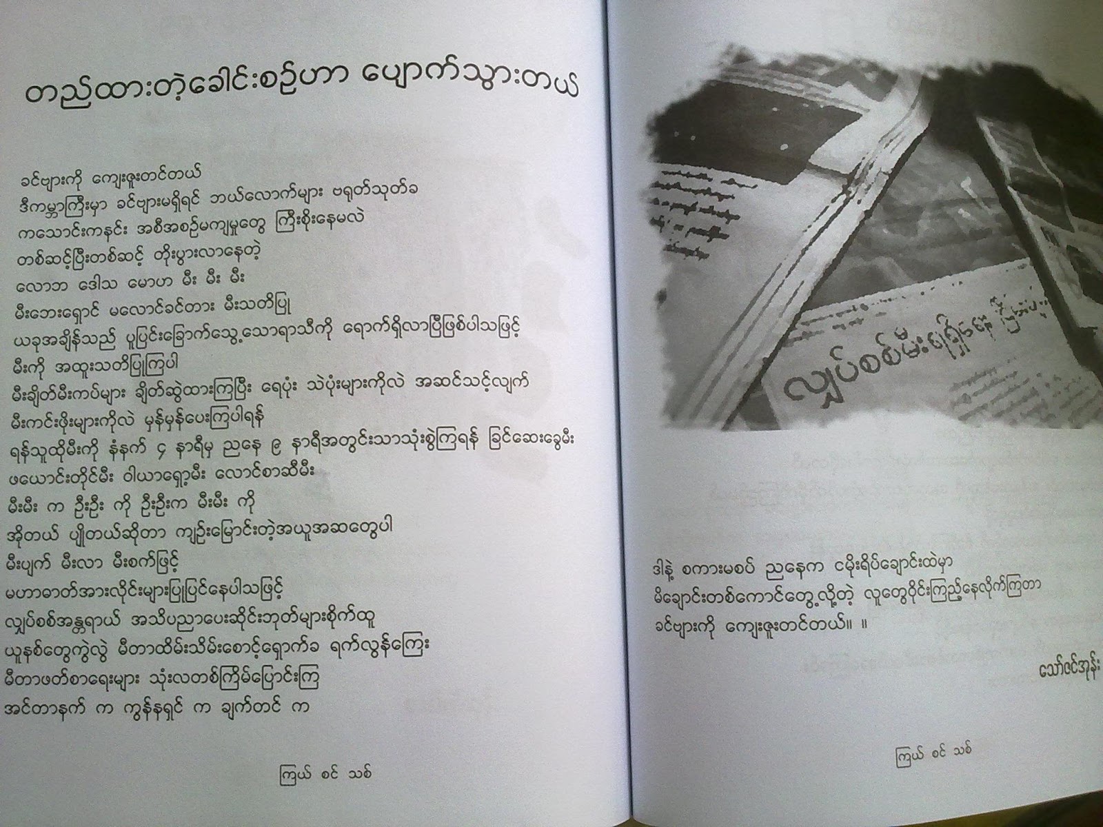 ရန္ကုုန္ျမိဳ႔တြင္ အဆိုုပါစာအုုပ္ထြက္ျပီဟုု ဆိုုသည္။ ေဖ့စ္ဘြတ္ေပၚတြင္ အဆိုုပါစာအုုပ္၏ ေကာ္ပီဓာတ္ပုုံမ်ားကိုု လက္ဆင့္ကမ္း မွ်ေ၀ထားသည္ကိုု ေတြ႔ရသည္။ ၈၈ မ်ဳိးဆက္ ေက်ာင္းသားမ်ား၊ ႏိုုင္ငံေရးအက်ဥ္းသားမ်ား၊ ကဗ်ာဆရာမ်ား၊ မ်ဳိးဆက္သစ္ ႏိုုးၾကားသူမ်ား စုုစုုေပါင္း ကဗ်ာဆရာ ၂၅ ဦး၏ ကဗ်ာမ်ား ျဖစ္သည္။