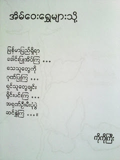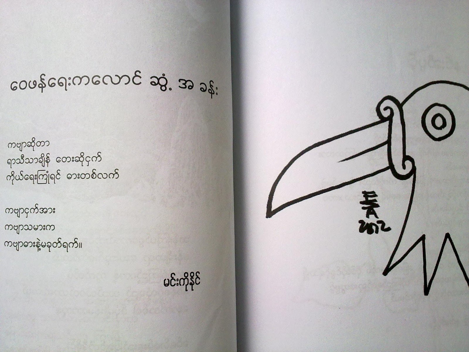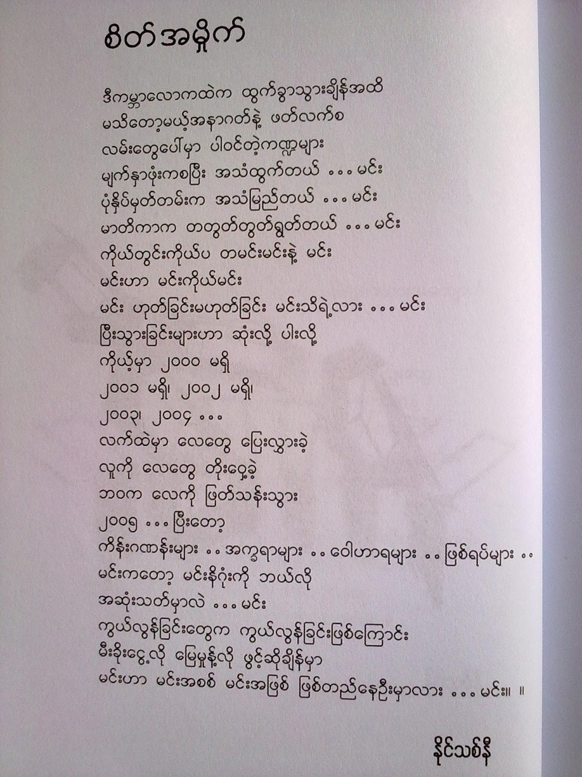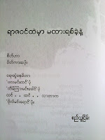 1. ဒီစာအုပ္ရဲ႕ စာမ်က္ႏွာ ၅၈ မွာ ပါတဲ့ ကိုမင္းကိုႏိုင္ရဲ႕ ႏွင္းဆီပြင့္ ဆိုတဲ့ ကဗ်ာေလးနဲ႔ပတ္သက္ၿပီး ေျပာစရာရွိပါတယ္။ အမွန္ေတာ့ ဒီကဗ်ာရဲ႔ ေခါင္းစဥ္က `ႏွင္းဆီနီဥဒါန္း´ ပါ။ ကၽြန္ေတာ့္ရဲ႔ ခၽြတ္ယြင္းမႈေၾကာင့္ ႏွင္းဆီပြင့္ဆိုၿပီး မွားယြင္းသြားခဲ့ပါတယ္။ ဒီအတြက္လည္း ကဗ်ာရွင္ျဖစ္တဲ့ ဆရာမင္းကိုႏိုင္ ကိုလည္း အႏူးအညြတ္ ေတာင္းပန္ၿပီးပါၿပီၤ။ အခု ဒီေနရာကေနလည္း ထပ္ေတာင္းပန္လိုက္ပါတယ္။ ဆရာမင္းကိုႏိုင္ခင္ဗ်ား – ကၽြန္ေတာ့္ရဲ႔ေပါ့ေလွ်ာ့မႈကို နားလည္ခြင့္လြတ္ေပးပါ လို႔ အေလးအျမတ္ ေတာင္းပန္ပါတယ္ခင္ဗ်ာ။ စာဖတ္သူေတြအားလံုးကိုလည္း လႈိက္လႈိက္လွဲလွဲ ေတာင္းပန္ပါတယ္။ ေနာက္ေနာင္မွာ ဒီလိုအမွားမ်ဳိး မလုပ္မိေစရပါဘူးလို႔ အထပ္ထပ္ ကတိေပးပါတယ္ခင္ဗ်ာ။ ျဖန္႔ၿပီးတဲ့စာအုပ္ အနည္းငယ္အတြက္ လိုက္ျပင္ဖို႔ခက္ခဲေပမဲ့ ကၽြန္ေတာ့္မွာ ရွိေနတဲ့ စာအုပ္ေတြအားလံုးကိုေတာ့ ကဗ်ာေခါင္းစဥ္ေတြ လိုက္ျပင္ေနပါၿပီ။ ဒီကေန႔ ထြက္တဲ့ street view ဂ်ာနယ္မွာလည္း ကၽြန္ေတာ္မေန႔က ေျပာျပလို႔ မွားယြင္းတဲ့အမွားအတြက္ ေတာင္းပန္ထားတာ ပါပါတယ္ခင္ဗ်ာ။ ေနာက္ထပ္ လည္း ဂ်ာနယ္စာမ်က္ႏွာေတြေပၚကေန ကၽြန္ေတာ့္အမွားအတြက္ ဆက္လက္ ေတာင္းပန္သြားဦးမွာပါ။ ကၽြန္ေတာ့္အမွားအတြက္ ကၽြန္ေတာ္မွာသာ တာ၀န္ရွိပါတယ္ခင္ဗ်ား။ ကၽြန္ေတာ့္ကို ခြင့္လြတ္ေပးၾကပါ။